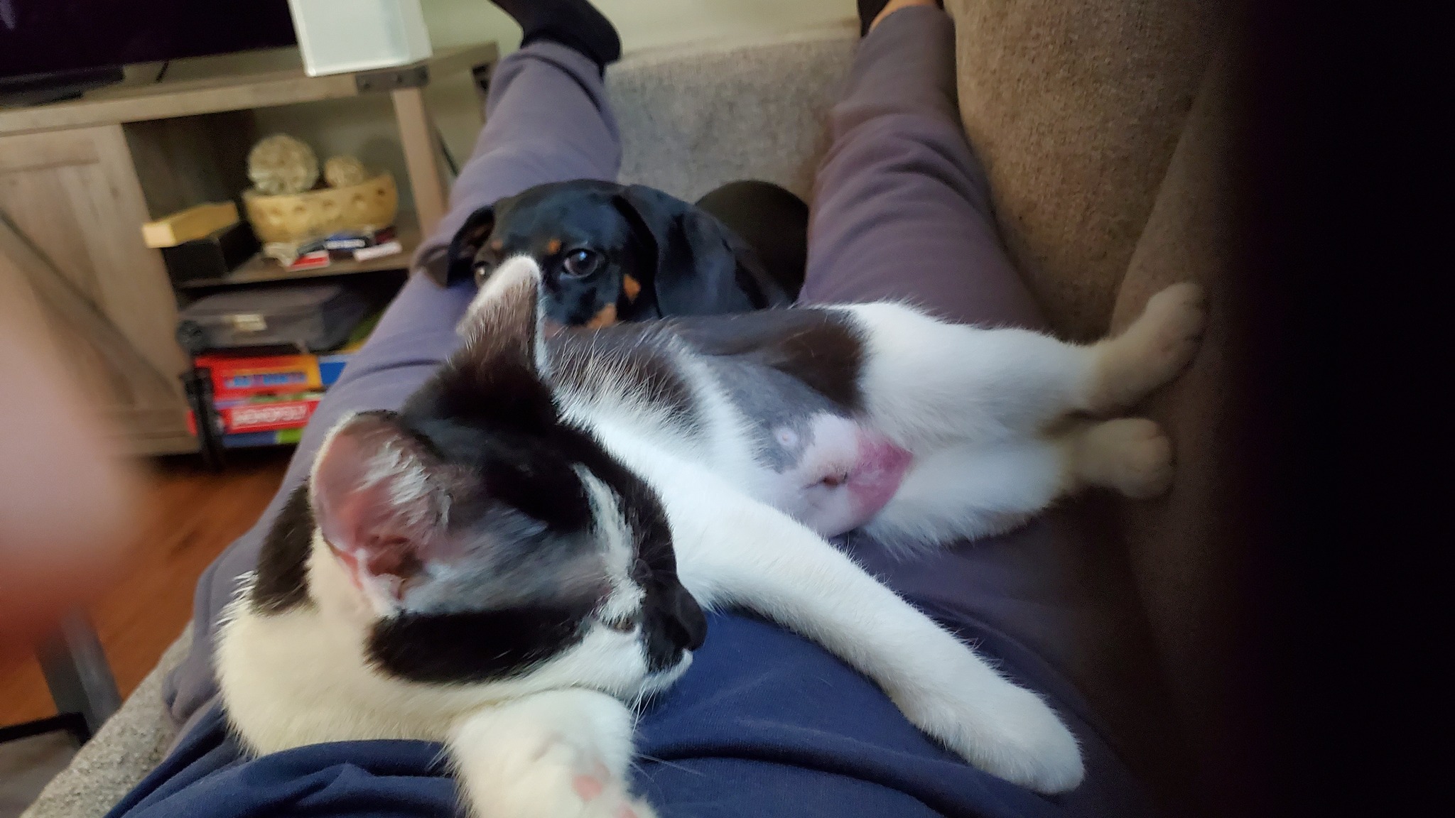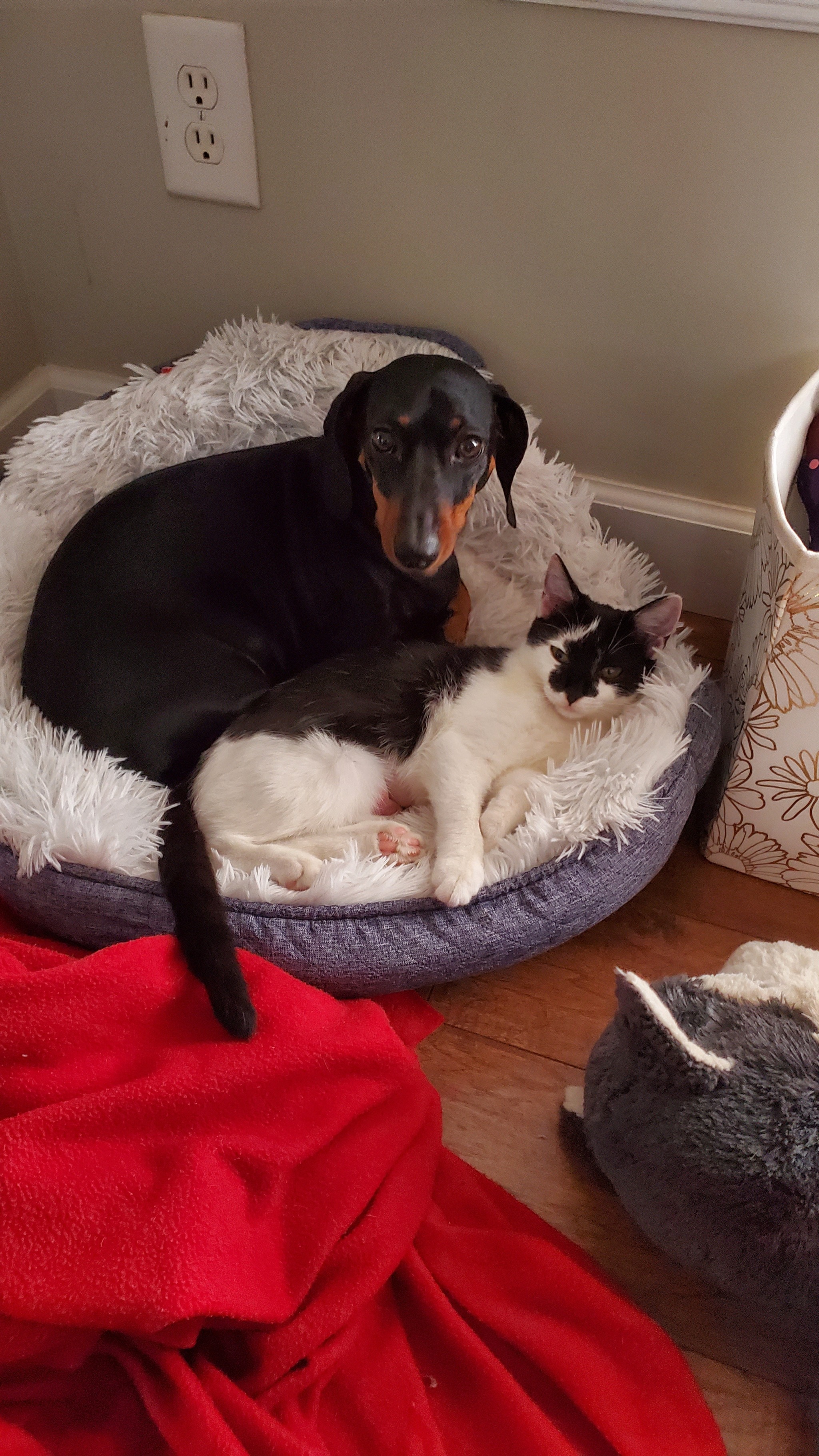 В этом посте напишу про новых жильцов. Два кота, что мы забрали из России, ушли на радугу от болезней и старости. Перед этим меня шесть лет дочь с женой уговаривали на собаку. Собак я не сильно люблю. Плюс с ними надо гулять. А я ленивый. Прекрасно понимал, кто этим будет заниматься. Но в какой-то момент я тоже решился. Но с условием: собака должна быть умной и маленькой, ну как кот. Из данной категории подходили только таксы. А учитывая, что есть порода мини-такса, то вообще идеально. Насчёт каноничности такс в США я не знаю, мне кажется, в США в основном мини-таксы, а не обычные, которые больше. Есть ещё вообще мелкие: кроличьи таксы. В США породистые собаки — это бизнес. Их часто разводят в плохих условиях, держат в клетках. Поэтому решение было принято не идти к заводчикам, а забрать щенка из таких условий к себе и окружить его заботой и теплом. Нашли по объявлению у мексиканцев, приехали и купили за 600 баксов. Собаку назвали Ириской, по-местному Iris (Айрис). Щенка воспитывали коты, поэтому она получилась хорошим котом. Всё, как я и хотел. Сообразительность тоже присутствует: может ходить рядом без поводка, никуда не убегает; если ушла дальше, останавливается и ждёт нас, смотря в нашу сторону. Когда ездим на кемпинг, то не уходит за пределы нашей территории и знает, где охранять. Из минусов: не любит маленьких детей, облаивает всех собак, кто проходит мимо дома, и иногда гадит дома. Гадит, чтобы метить территорию, так как усиленно делит меня со старшим котом, который ещё из России. Конфликтуют молча, но друг друга не любят. С остальными котами дружит, так как не надо делить меня: старший кот от меня всех отгоняет. Такса научилась от котов спать на спинке дивана, драться передними лапами, хватая как кот. И даже тереться об ноги. Старательно учу её мяукать, иногда получается, но не всегда. Тогда просто воем вдвоём в два голоса. Собака диванная и "поджопник", потому что любит пристроиться под задницу, под ноги. Обожает спать под пледами и под одеялом, чтобы зарыться поглубже и высунуть нос, чтобы дышать. Не любит белок. Они сидят на дереве и дразнят её своими криками, спускаясь совсем вниз, а ей так хочется поймать, но не может. Поэтому злится. А те развлекаются.