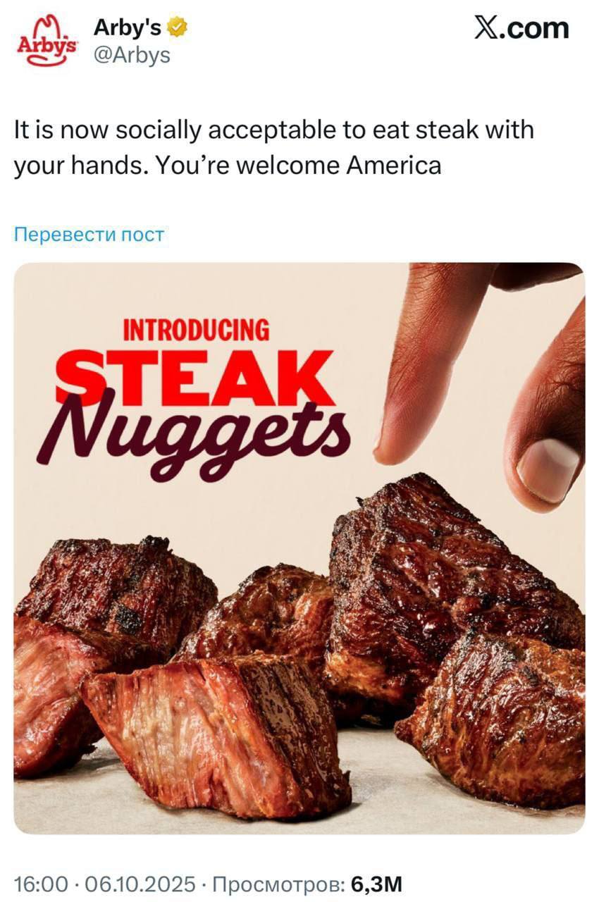 Новое достижение американской фастфуда. Сеть быстрого питания Arby's представила «уникальное» блюдо — они порезали стейк на маленькие кусочки и назвали их стейк-наггетсы.