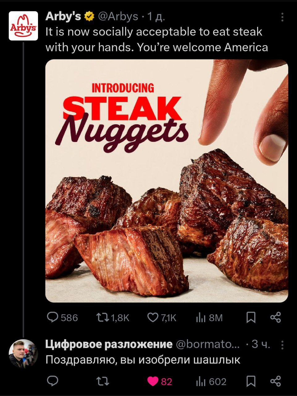 5357 Itztlacoliuhqi Кулинария Американцы изобрели стейк-наггетсы1 3 месяца назад Шашлык Наггетсы Юмор Еда Стейк Мясо Скриншот Повтор X (Twitter) Комментарии 728 58 15 10 3 1 Ещё 1