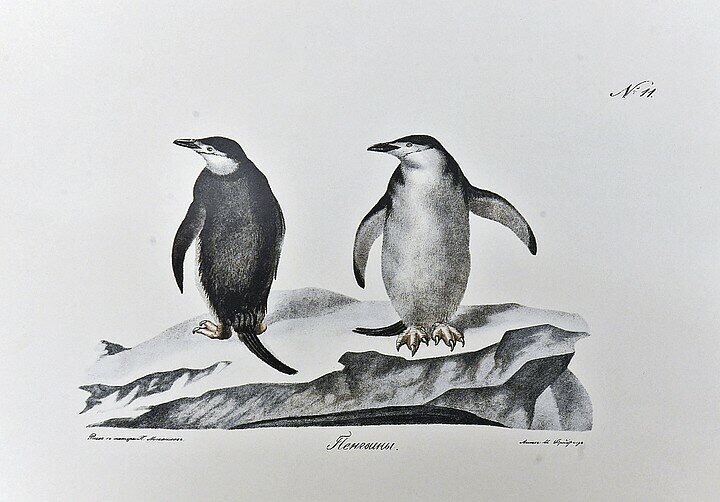 Аборигены Антарктики - пингвины. Рисунок из «Атласа к путешествию капитана Беллинсгаузена, 1831 г.».