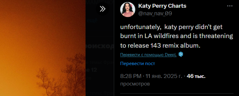 14 VladVoff Американцы шутят насчет поп-звезд и пожара в Лос Анджелесе 10 месяцев назад Перевод: "К сожалению, Кэти Перри не сгорела в лесных пожарах Лос-Анджелеса и грозится выпустить еще 143 ремикс-альбома" США Пожар Катастрофа Лесные пожары 1 Ещё 0