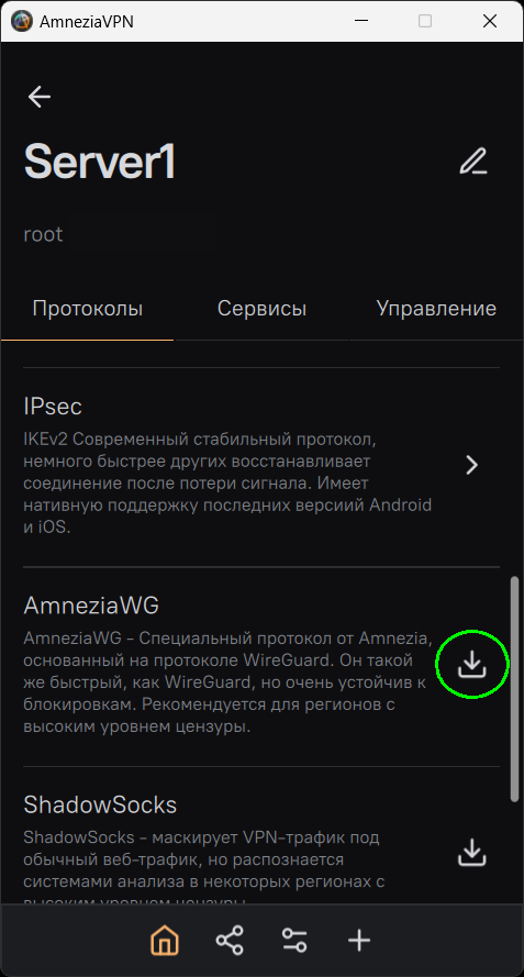 В списке протоколов находим "AmneziaWG" и нажимаем на пиктограмму справа: