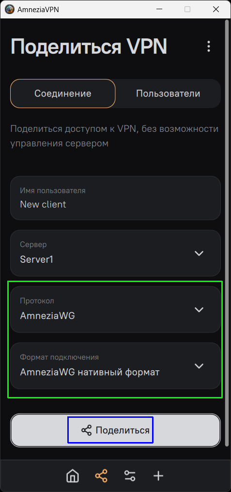 Для начала надо найти кнопку "Поделиться" (нижний левый угол на скриншоте выше). Потом надо выбрать протокол и его конфигурацию. Хочу обратить особое внимание на два параметра, которые находятся внутри зелёной рамочки на скриншоте ниже: