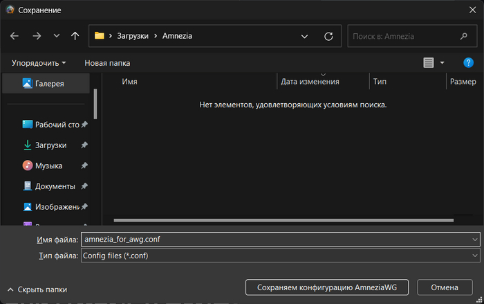 Выбираем куда сохранять, нажимаем кнопку "Сохранить конфигурацию AmneziaWG". А потом не забыть, куда именно его сохранили.