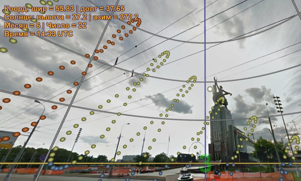 Больше года назад был опубликован мой видеоматериал о ходе солнца, который добрался и до пикабу: http://pikabu.ru/story/kak_solntse_khodit_po_nebu_3767009. Я всё подумывал, и вот наконец дошли руки до совмещения сферических панорам из гугл-карт (стянуто при помощи StreetView Grabber) и пояса аналемм (пояса, внутри которого ходит солнце для данной местности). Взял одну из точек гугл-панорам (Москва, памятник Гагарину), и получилось примерно вот что: https://daybit.ru/pano_streetview/pano1701_msk_gagarin/pano_... (в этом скрипте вы можете покрутить солнце самостоятельно, основные управляющие клавиши - стрелки). Заодно можно проверить (см. картинку), в какой сезон и в какое время суток проезжала гугловская машина мимо Гагарина: вторая половина июня, почти 08 часов по всемирному времени UTC.