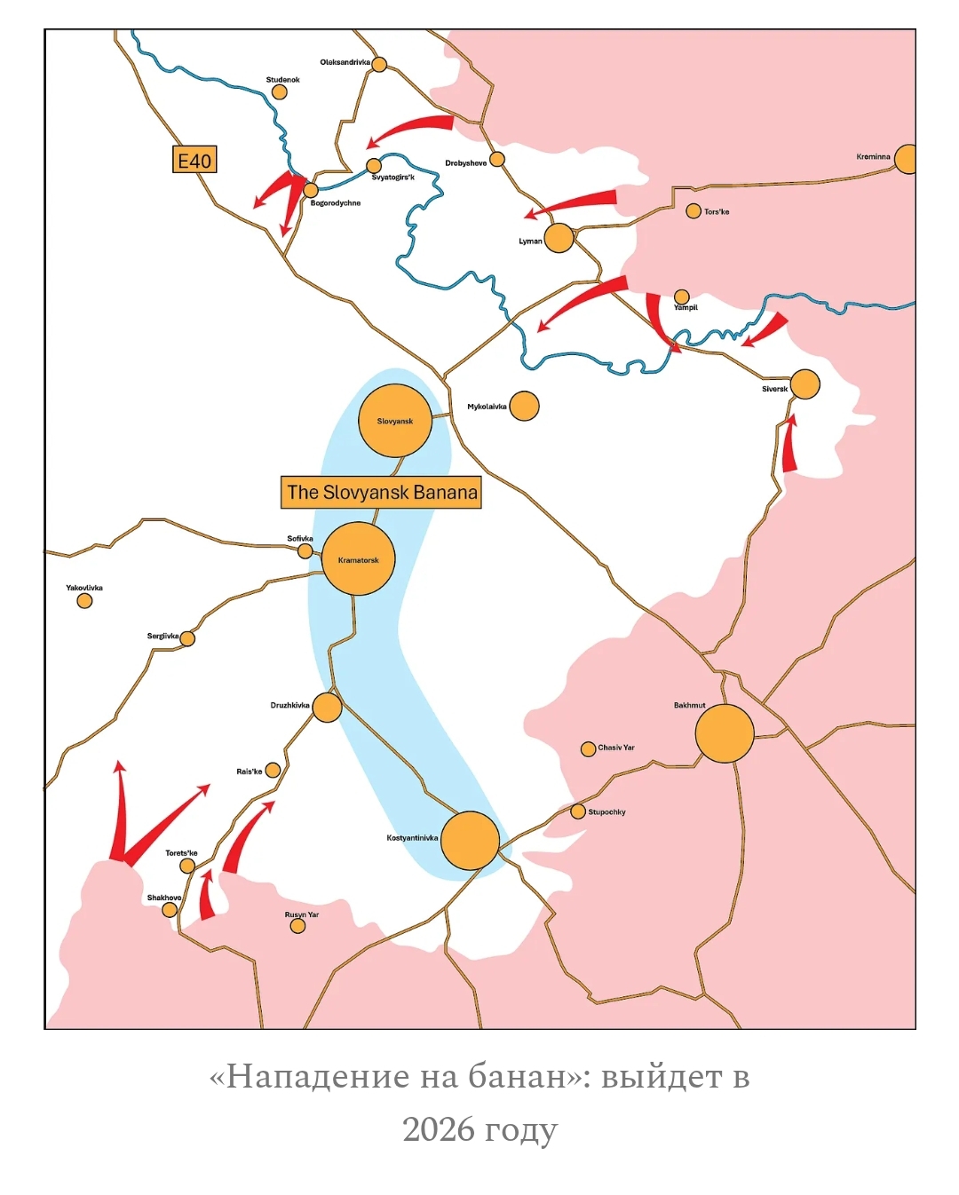Основная мысль, которую мы пытаемся здесь донести, заключается в том, что ошибочно считать «второстепенными» российские наступления в Серебрянском лесу, формирующийся выступ севернее Покровска и их продвижение в излучину Донца. Уменьшение масштаба до соответствующего значения показывает, что это концентрические операции, формирующие фронт наступления на Банану в 2026 году: движение к трассе E40 с севера, обход оборонительного щита вокруг Сиверска и выход в подбрюшье Бананы через Райское.