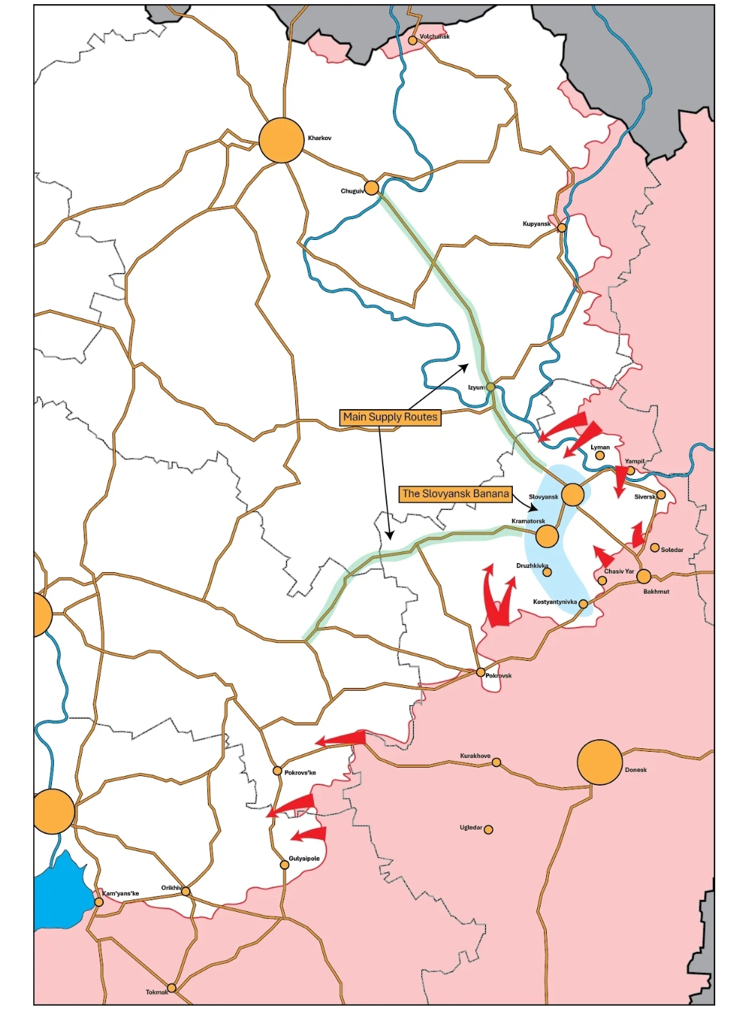 Второй важный факт о «Банане» заключается в том, что, несмотря на свои размеры, она поддерживается всего двумя шоссе, подходящими с юго-запада и северо-запада соответственно, врезаясь в «Банан» клином. Если взять в качестве примера северное шоссе/МШР (трасса Е40), то мы видим, что действия России в излучине Донца едва ли можно назвать второстепенными: это жизненно важные операции, связанные с сохранением целостности «Банана».