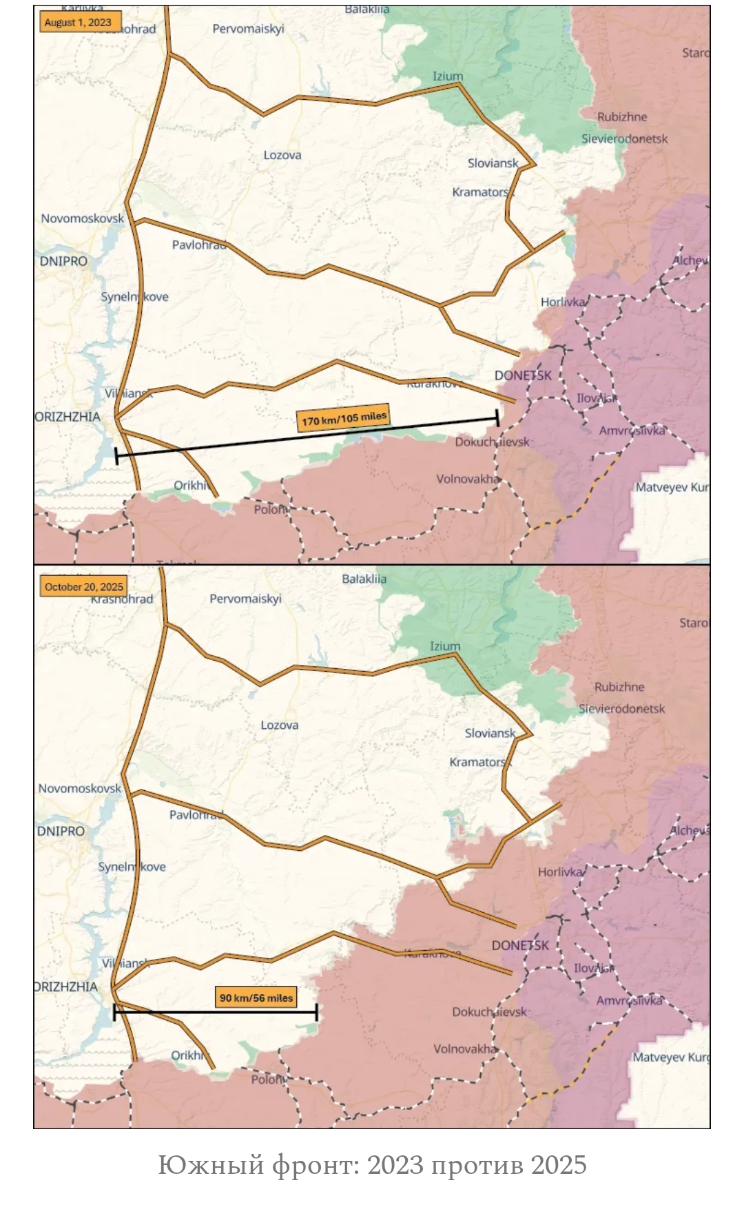 Честно говоря, общий оптимизм в украинской инфосфере, царивший большую часть лета, показался мне на удивление странным. В этом году линия фронта не принесла Украине по-настоящему хороших новостей. Помимо более широкого стратегического момента, заключающегося в том, что Украина потеряла инициативу и, похоже, не способна её вернуть, Россия захватывает два важных населённых пункта (российские войска находятся в центрах Покровска и Купянска), начала наступление как минимум на два других (Лиман и Константиновка), прорвала половину южного фронта и очистила большую часть внутренней излучины реки Донец-Оскол. «Банана» на подходе к 2026 году.