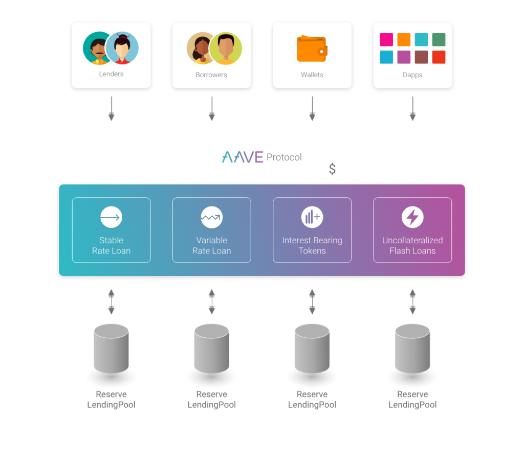AAVE — это децентрализованный и не связанный с хранением токен ликвидности с открытым исходным кодом, который помогает пользователям давать и брать взаймы криптовалюты. Кредиторы могут получать значительный процент от размещения активов в специально созданных пулах ликвидности. Тем не менее, заемщики могут впоследствии использовать криптовалюту в качестве залога для получения мгновенного кредита за счет этой ликвидности.