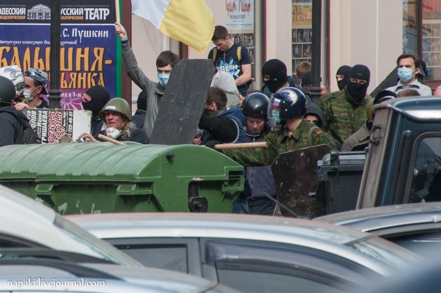 Про пожарную машину я не понял: на стриме я видел как еще до коктейлей Молотова на тесной улице две кучки людей стояли лицом друг к другу, посередине была пожарная машина которой сначала выбили стекло, а потом люди с флагом Украины залезли внутрь (там еще мужик в каске выбивал остатки стекла топором), но поехали не на пророссийских активистов, а назад, причем вместе с ними с улицы ушли и почти все люди в касках и с украинскими флагами . Это про этот момент в статье говорится, или таран баррикад был позже?