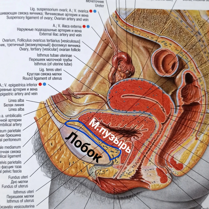 Сагиттальный распил женского таза, синим цветом выделено пространство Пирогова-Ретциуса