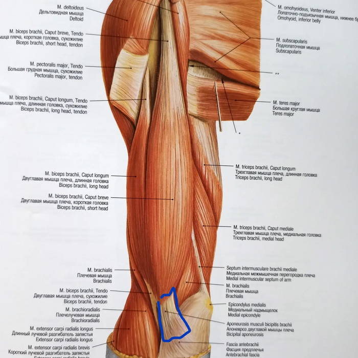Правая верхняя конечность, синим цветом выделен апоневроз Пирогова