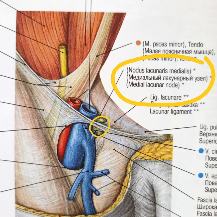 Паховая область справа, выделен лимфатический узел Пирогова-Розенмюллера
