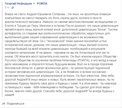 Инопланетяне забрали, за раскрытие заговоров? Фоменко канкурента подсидел? Или Скляров просто ушел из своей альтернативной археологии назад в традиционную инженерию (или кто он там по образованию)?