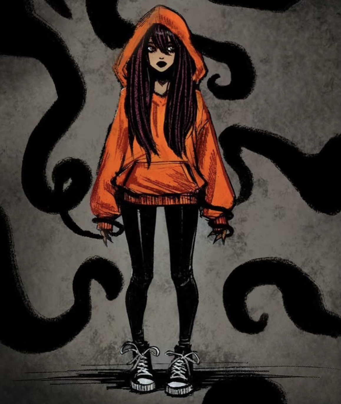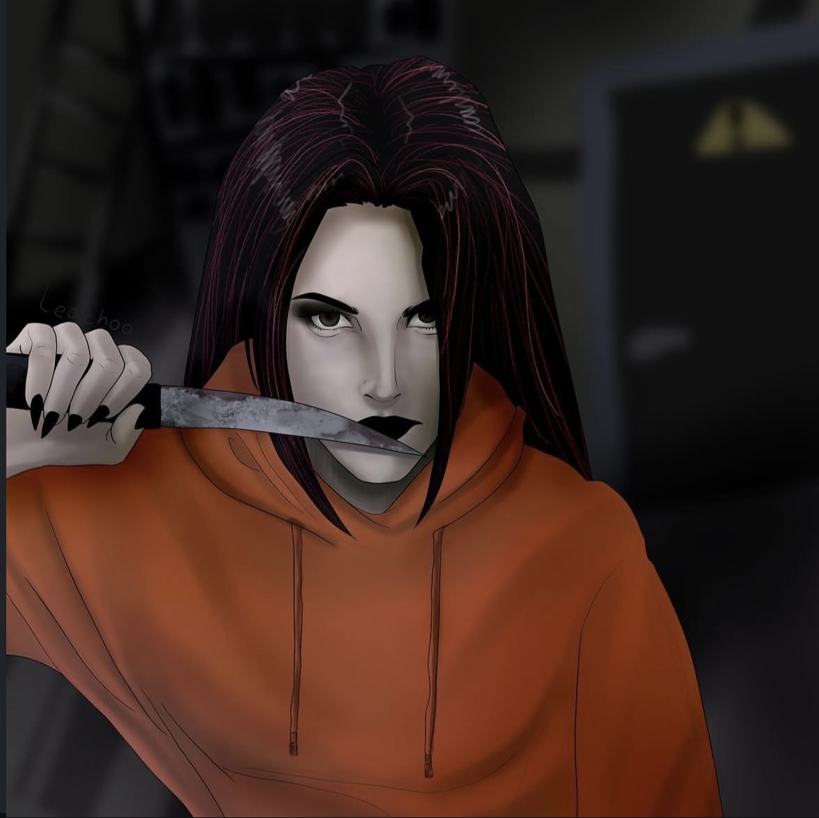 • Чаще всего её описывают как девушку с длинными чёрными волосами и бледной кожей. Так же она носит оранжевую оверсайз худи и черные леггинсы с серыми кроссовками, по описанию найк. Так же под худи у нее есть серый топ, а так же по всему телу кроме лица, шеи и кистей рук у нее есть множество не заживших синяков от побоев её отцом.