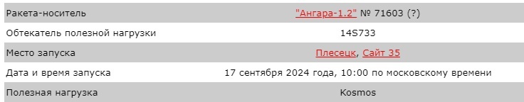 17 сентября 2024 года российские военные объявили, что запуск ракеты «Ангара-1.2» с несколькими космическими аппаратами для Министерства обороны состоялся в 10:00 по московскому времени и прошел успешно. Также сообщается, что космические аппараты был выведен на запланированную орбиту и находился под контролем наземных средств Воздушно-космических сил России