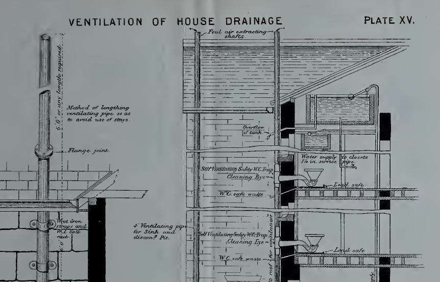 Плотная городская застройка появилась вместе с образованием городов, а вот канализация значительно позже. Первопроходцами строительства первых современных центральных канализаций в частных домах стали англичане, первые малые городские проекты появились уже в 1830-е годы. Крупными капитальными (камень, кирпич) домами было уже все застроено и вот только только пришло время проводить канализацию.... а дома уже лет 50 как построены и там живут люди, внутри места для проведения стояков уже не было. Выход один - санузлы и ванные часто организовывали в уже существующих помещениях со стороны двора (чтобы не портить приятные парадные фасады) или прокладывали трубы через кухни, если конечно схемы позволяли. Канализационные стояки и вентиляционные (фановые) трубы проводят прямо по фасадам уже построенных зданий.