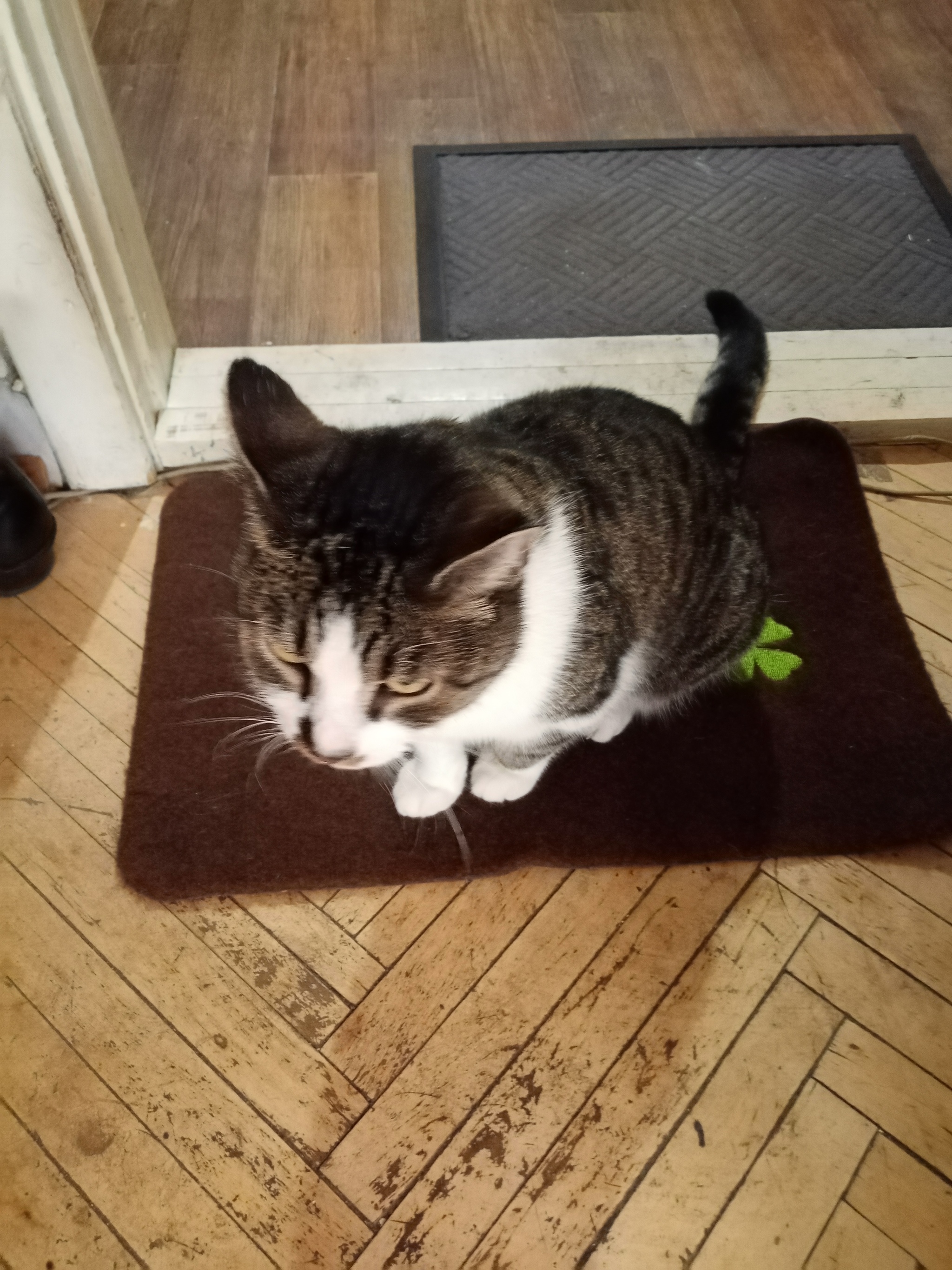 Помогите перевести надпись на коврике, кот две минуты через порог разглядывал, зашёл, посидел. Потом на стул спать со взглядом волчицы. Вроде того, убирай его, или вместе с ним убирайся, а я немецкий учил, может, там неприятное для него. Вроде бы про любовь. Хелп.
