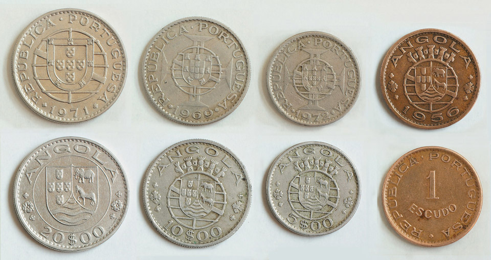 10, 5 и 2,5 эскудо на аверсе имеют малый герб Португалии, реверс – как у 20 эскудо. 1 эскудо на аверсе несет уже герб Анголы, а на реверсе только номинал.