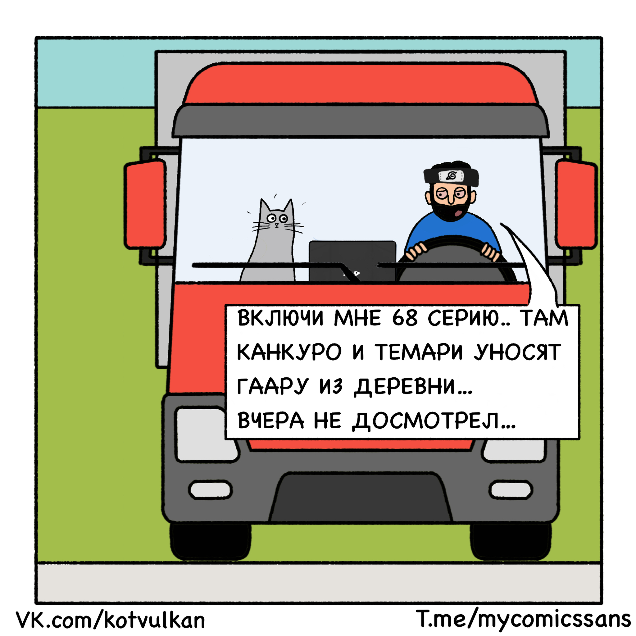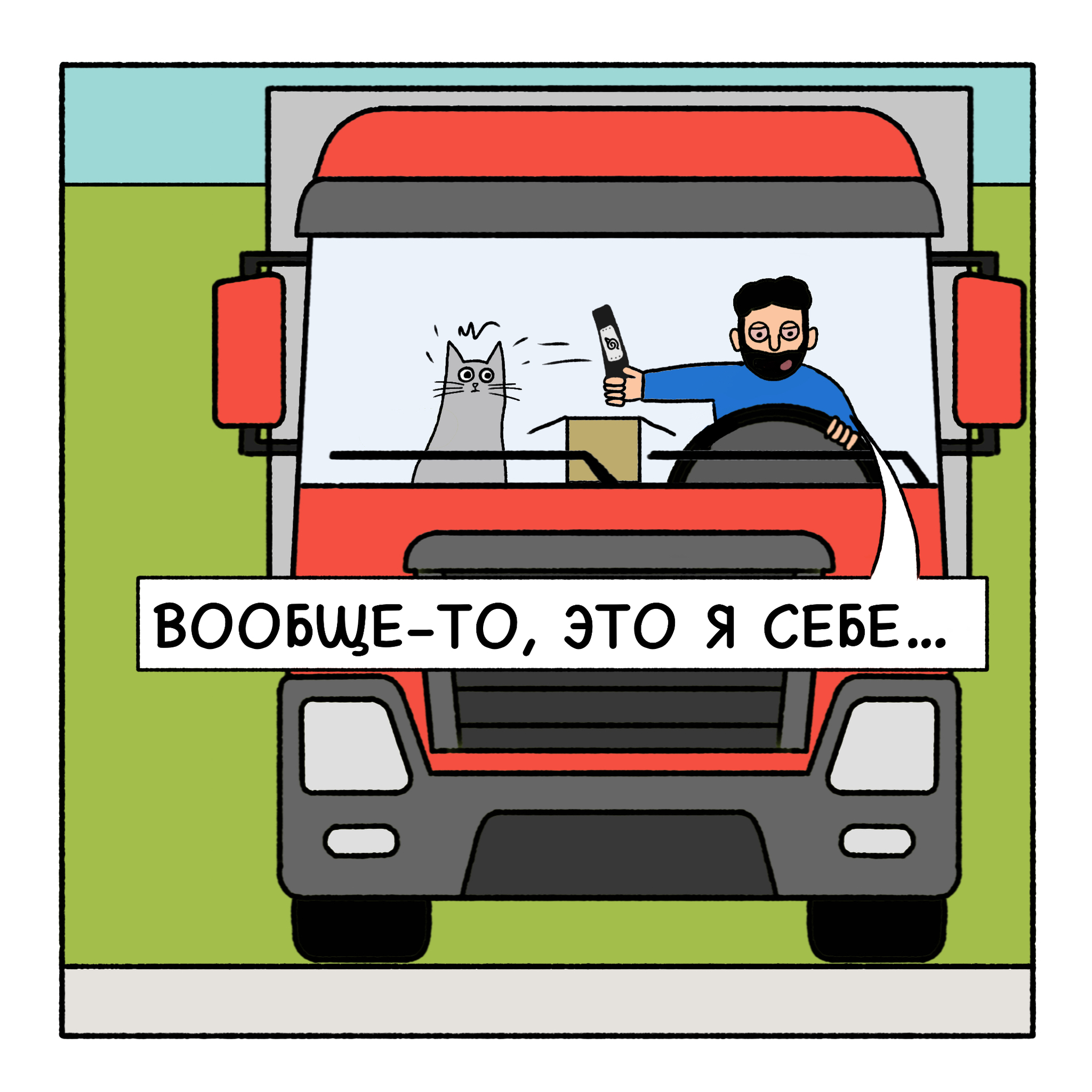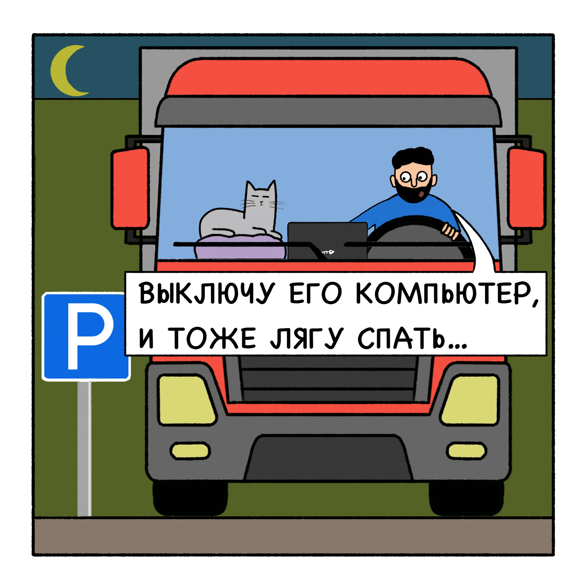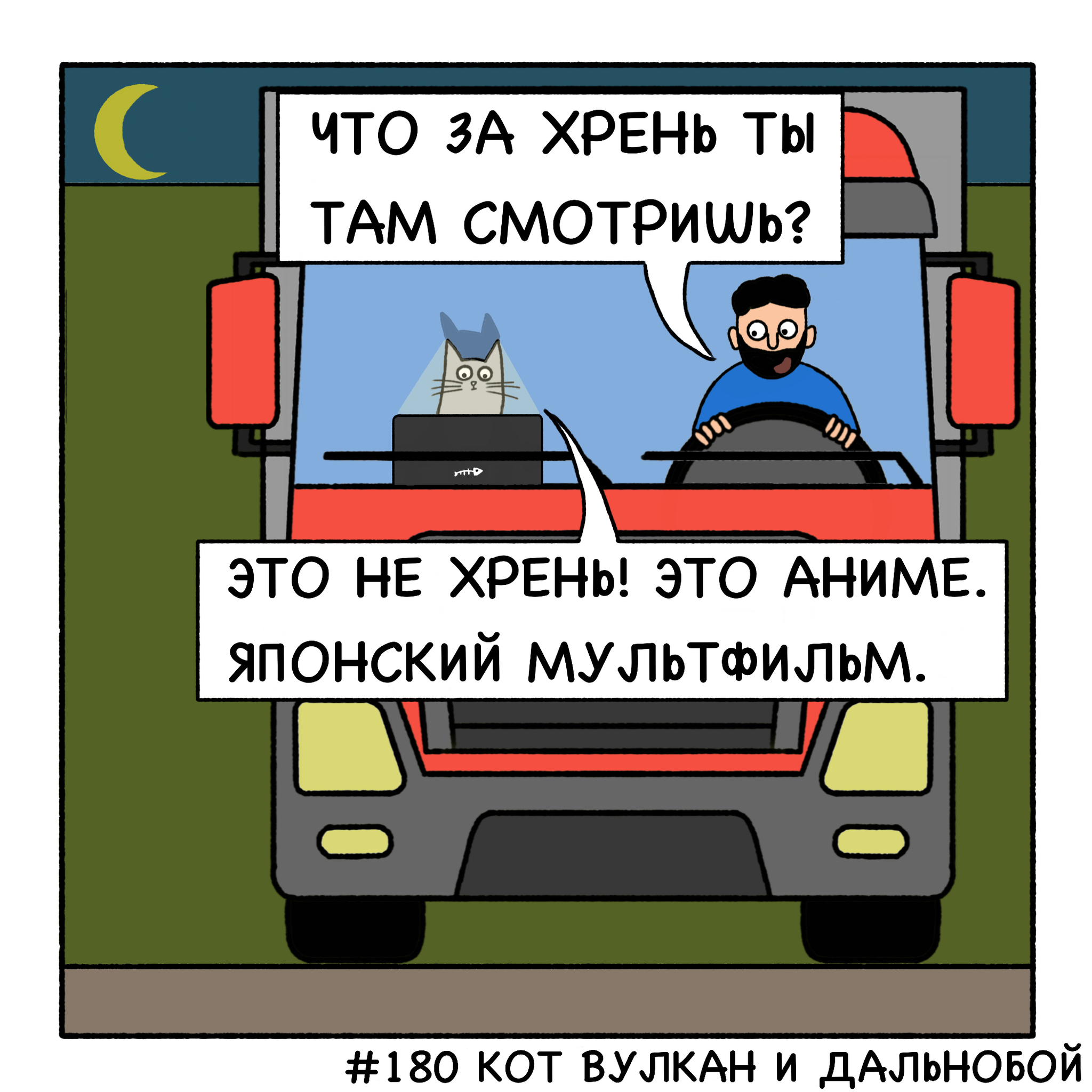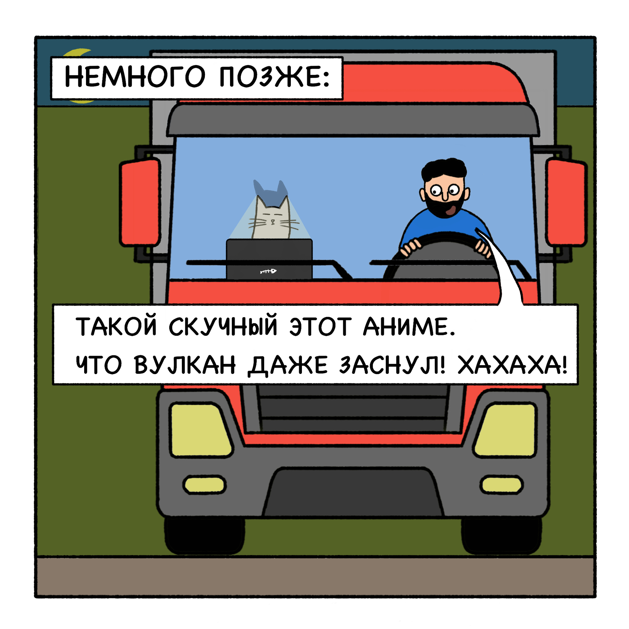 Кот Вулкан и дальнобой едут далеко-далеко. В дороге дальнобоя развлекает очень эрудированный и умный кот Вулкан.