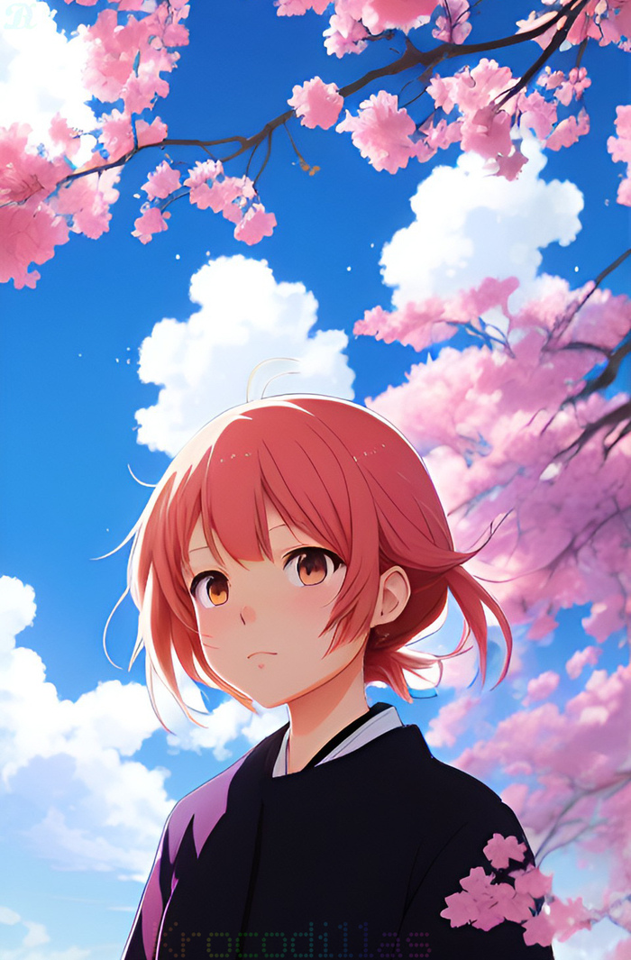 Девочка-подросток с короткими розовыми волосами, большими оранжевыми глазами, чёрная кофта, голубое небо днём. Деревья, сакура, розовые листья. Рисунок в стиле аниме, портрет.