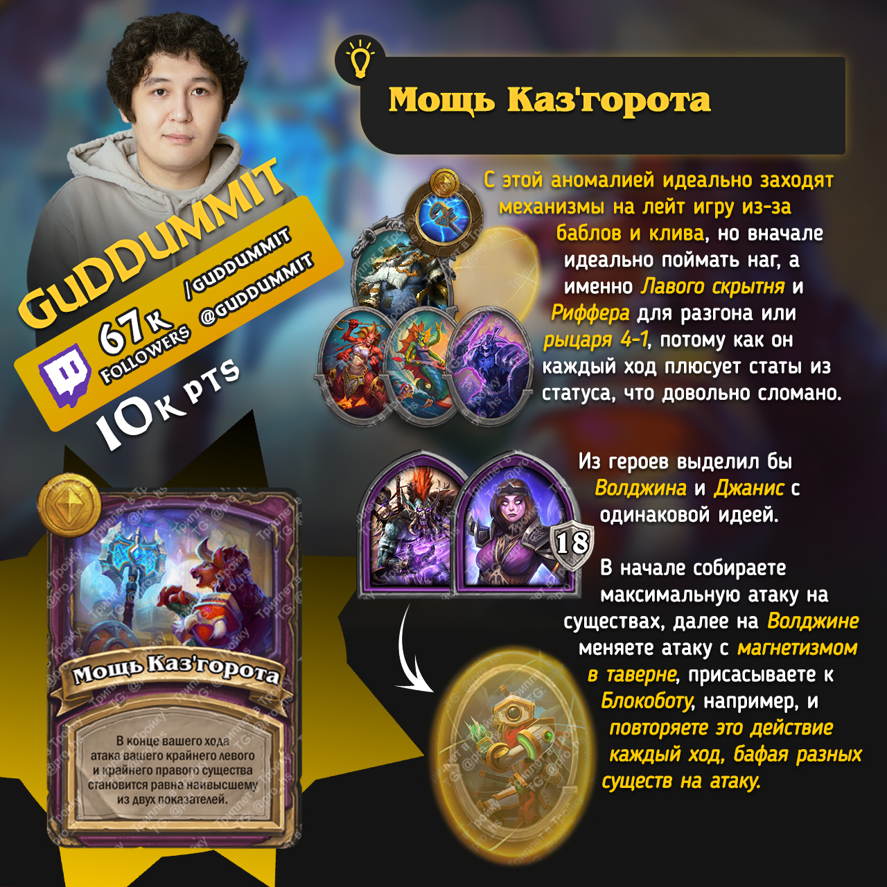ProHS Серия Аномалии Аномалия "Мощь Каз'горота" 2 года назад Сегодня рассмотрим как играть через аномалию Мощь Каз'горота.Арслан #GuDDummit рассказал каких героев он предпочитает с этой аномалией и почему. [моё] Hearthstone Meta Разбор Длиннопост 1 Ещё 0