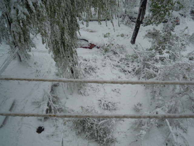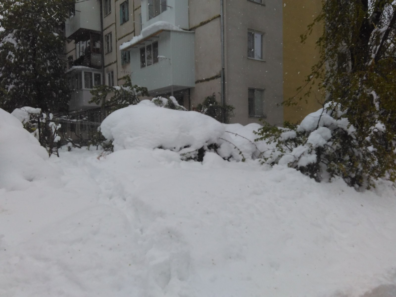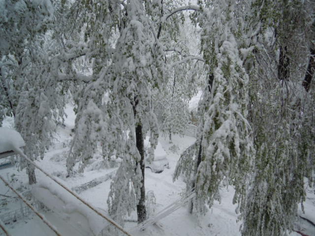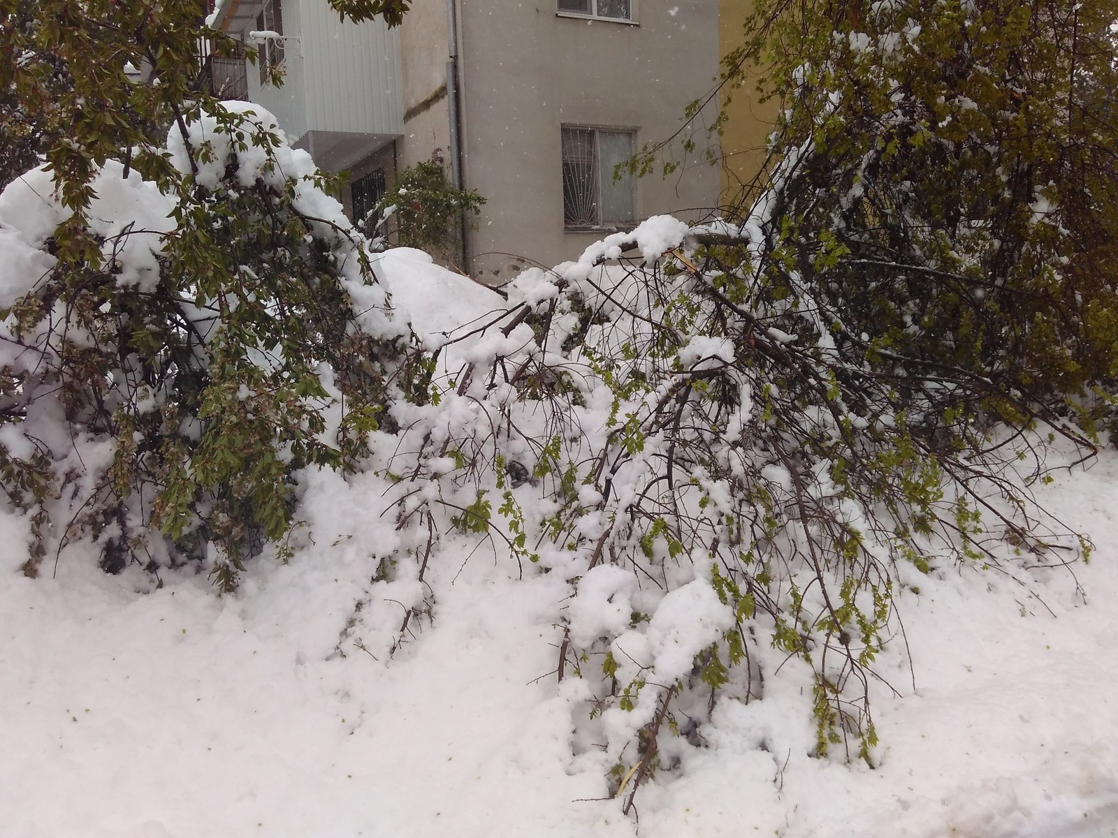 Из-за снега начали падать ветки и деревья.Некоторые дома остались без света .Большие ветки и упавшие деревья почти везде а общественный транспорт не работает .Прям хоть фильм катастрофу снимай XD.И это все длится уже 2-ой день.