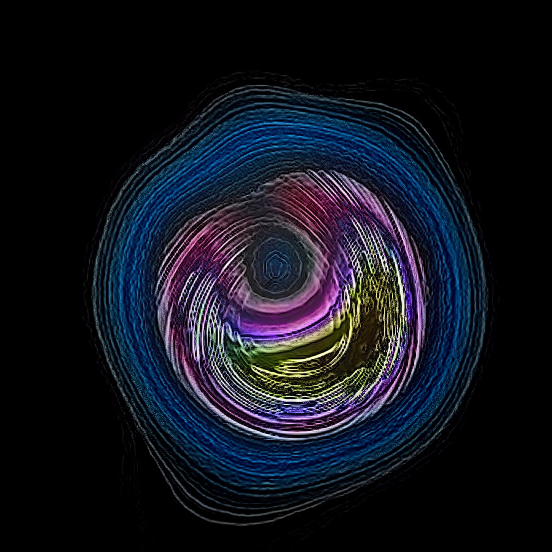 Цветное - это не черная дыра, цветом искусственно раскрашен аккреционный диск, окружающий ее. Черная дыра находится в темной области посередине. Линии здесь являются изолиниями, что означает, что каждый пиксель в линии имеет одинаковое значение, в данном случае значение температуры. Это означает, что вдоль линий температура материала, вращающегося вокруг черной дыры, примерно одинакова.