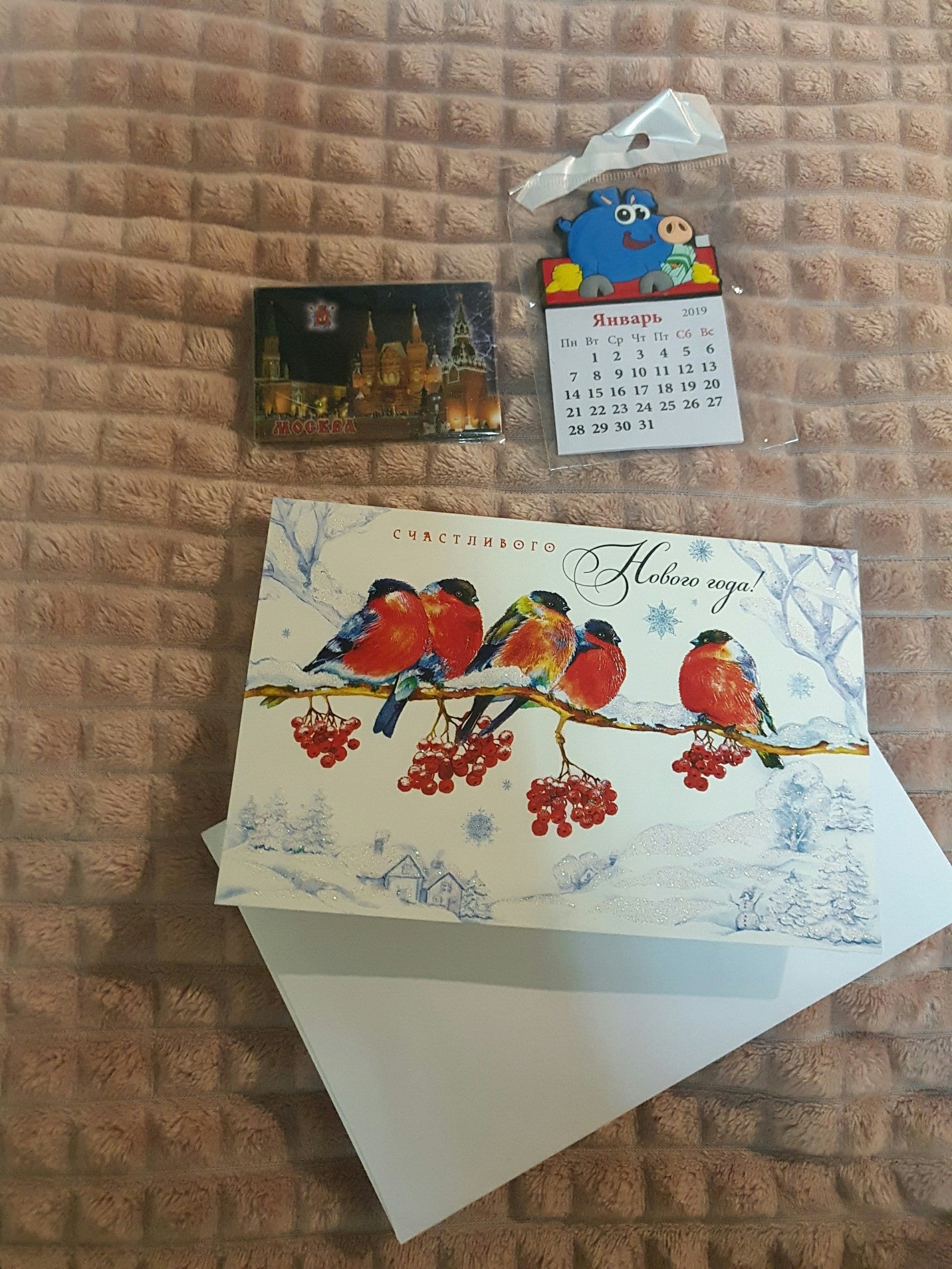 Магнитик, календарик и открытка с тёплыми пожеланиями от Снегурочки.