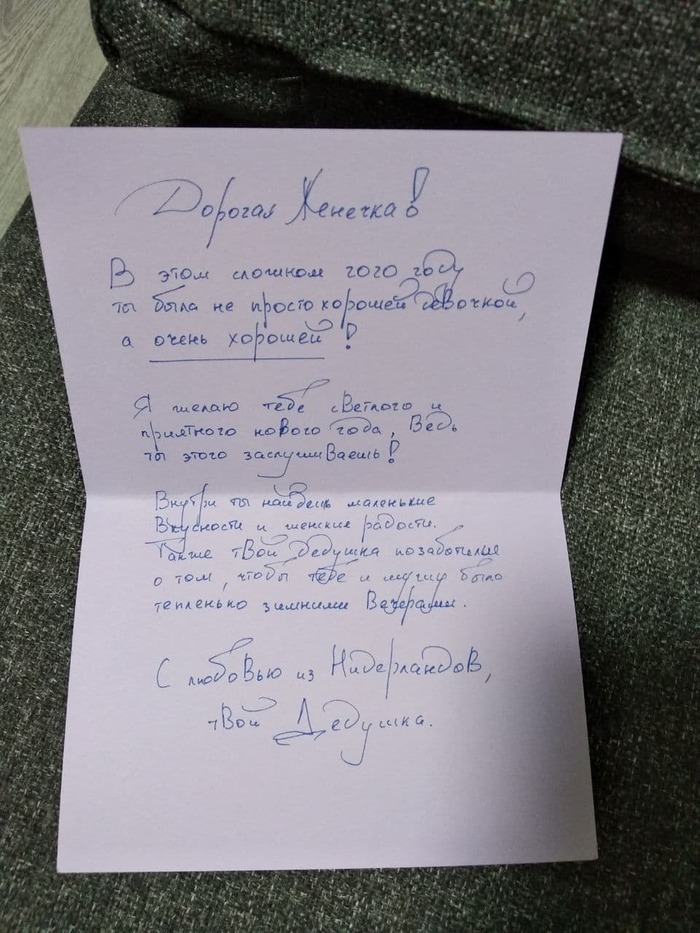 8-12-20 мне поступило сообщение на сайте - "Милая, дорогая Женечка! Твой Дедушка уже выслал тебе подарочек, надеюсь почта не оплошает и доставит в срок в лучшем виде! твой Дедушка." И транспортная компания - Post NL. Восторгу и удивлению не было предела.