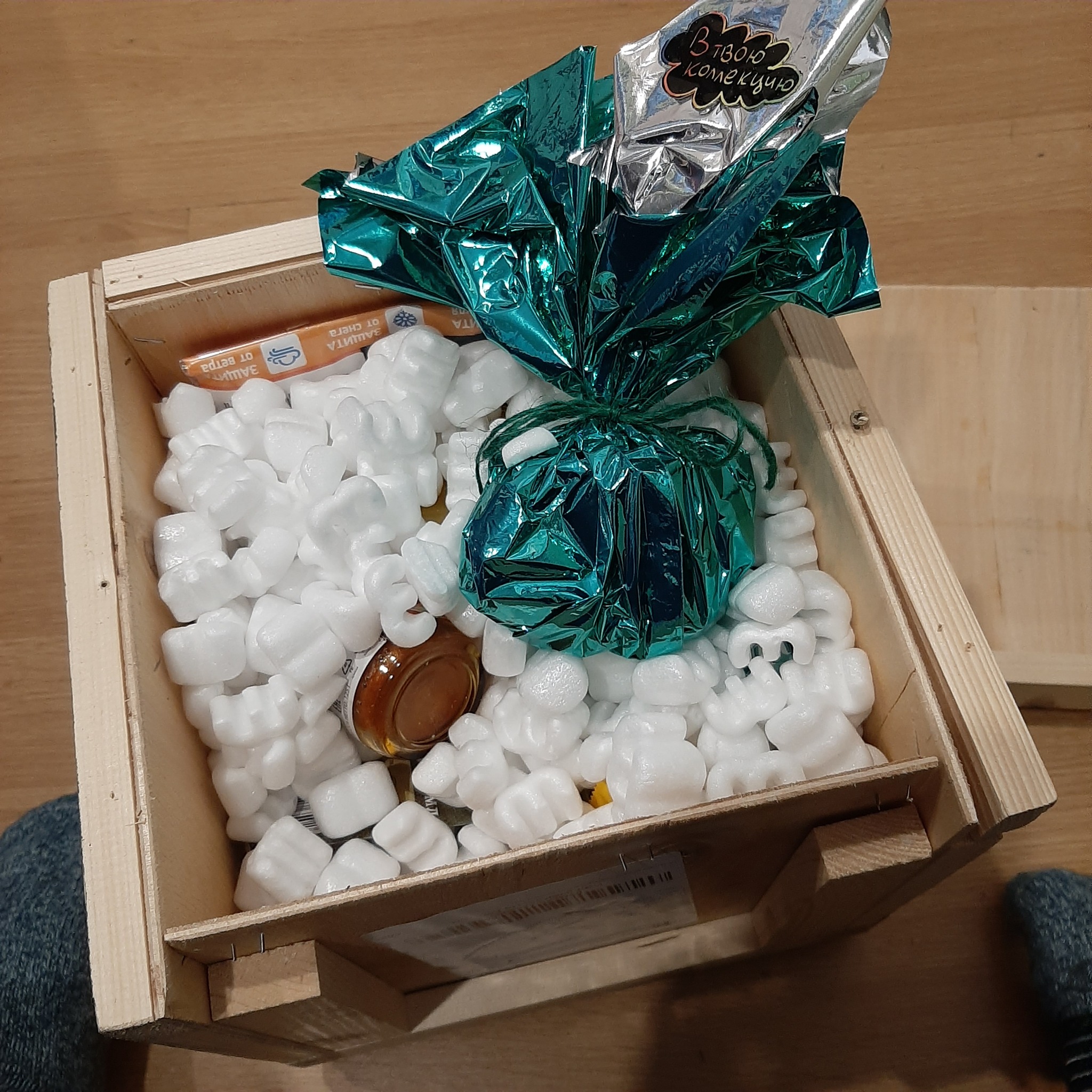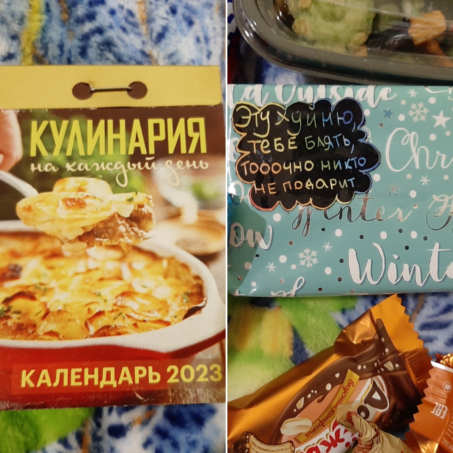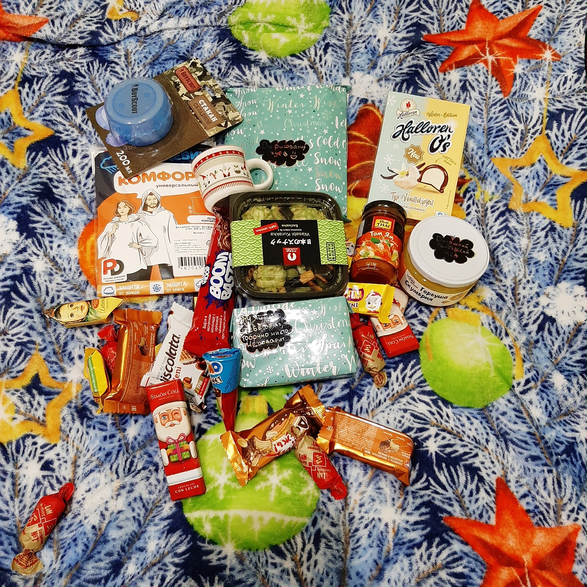 Подарок классный и чувство юмора зашло))) Кроме вышеперечисленного в подарке были: складной стакан (для поездок пригодится), дождевик (для Алтая и Петербурга), кротовуха по-азиатски (сюрприз!), тамбовский мёд (такой ещё не пробовали), кофейная новогодняя кружка в коллекцию, конфеты, азиатские вкусняшки. Фото нет, ибо дед фотографирует, как умеет, еле еле вышевыложенные фото отредактировали.