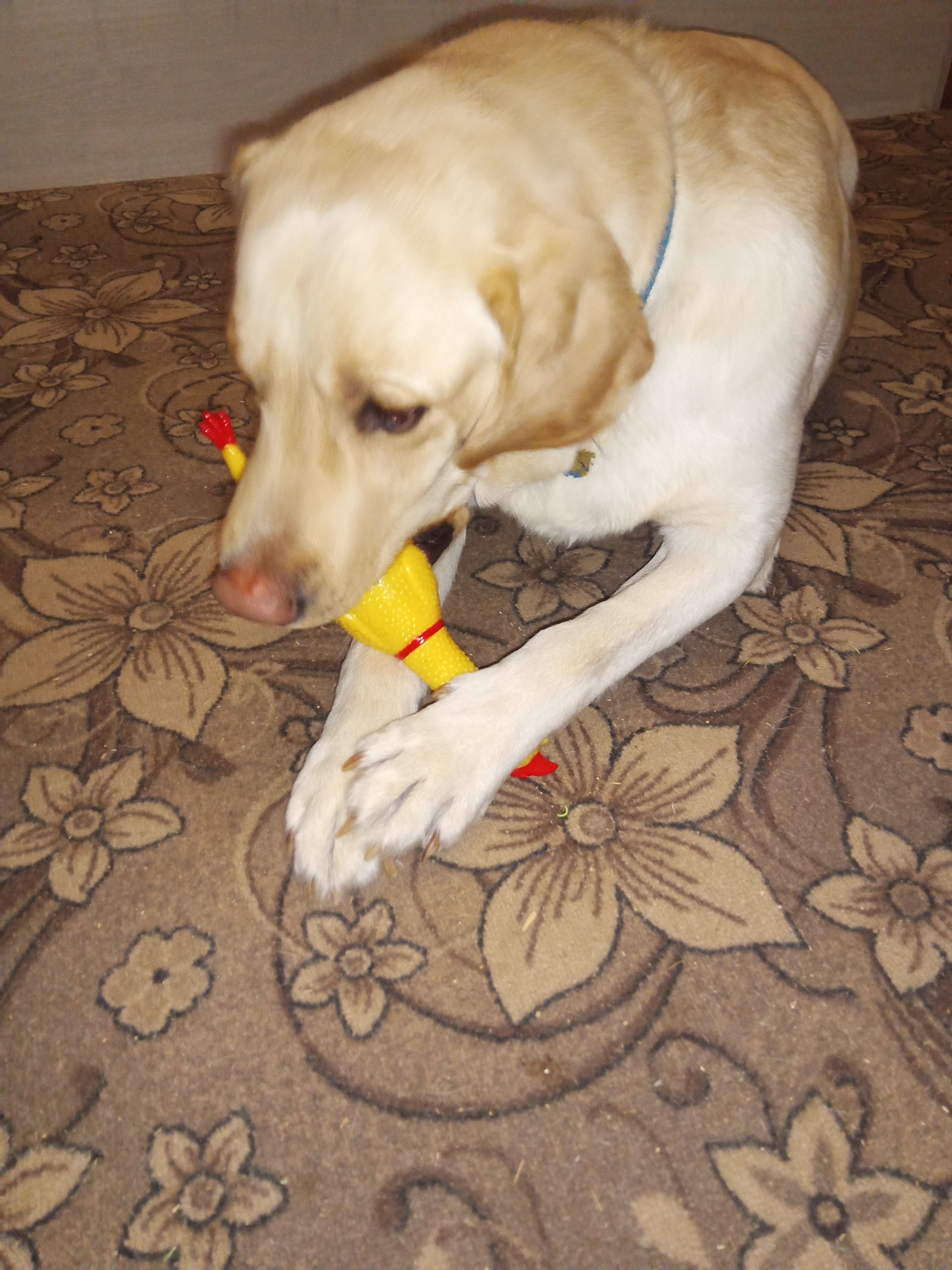 Наконец, наш лабрадорус в честь праздника получил задорно пищащую курицу. Естественно, он в восторге.