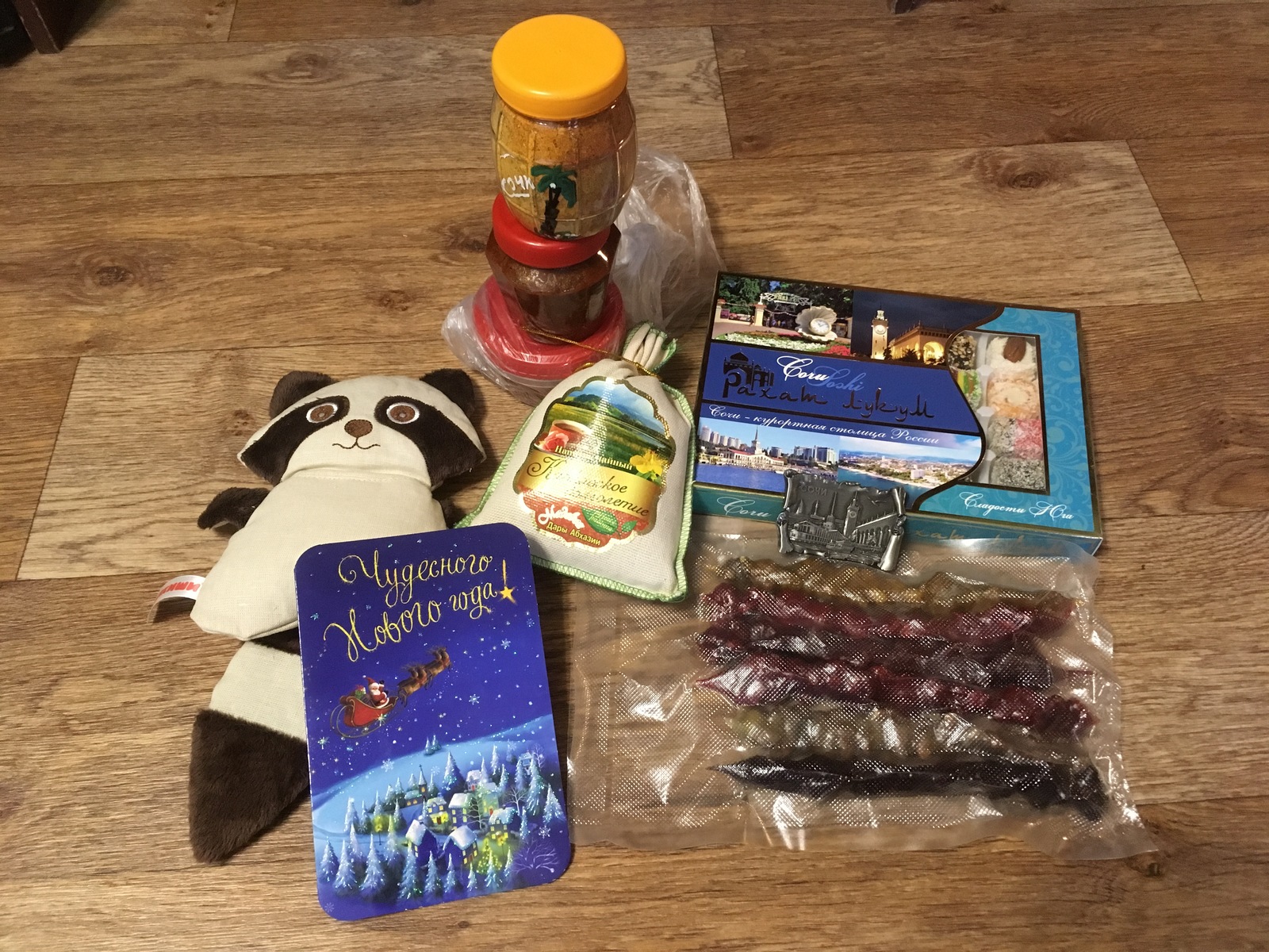 Дмитрий, ещё раз, огромное спасибо за частичку лета посреди зимы. За специи, аджику, чурчхелу, мёд, рахат лукум, потрясный магнит с видами Сочи, и ароматный травяной чай, мы как будто побывали там сами. И отдельное спасибо за подарок для дочки, енотик ей пришёлся по душе )