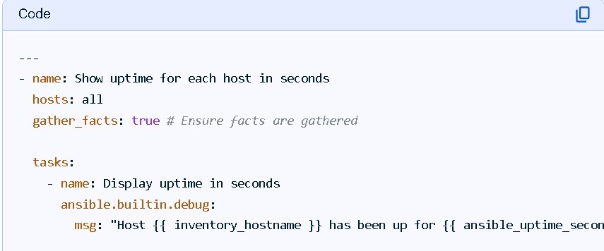 12345678msg: "Host {{ inventory_hostname }} has been up for {{ ansible_uptime_seconds }} seconds."