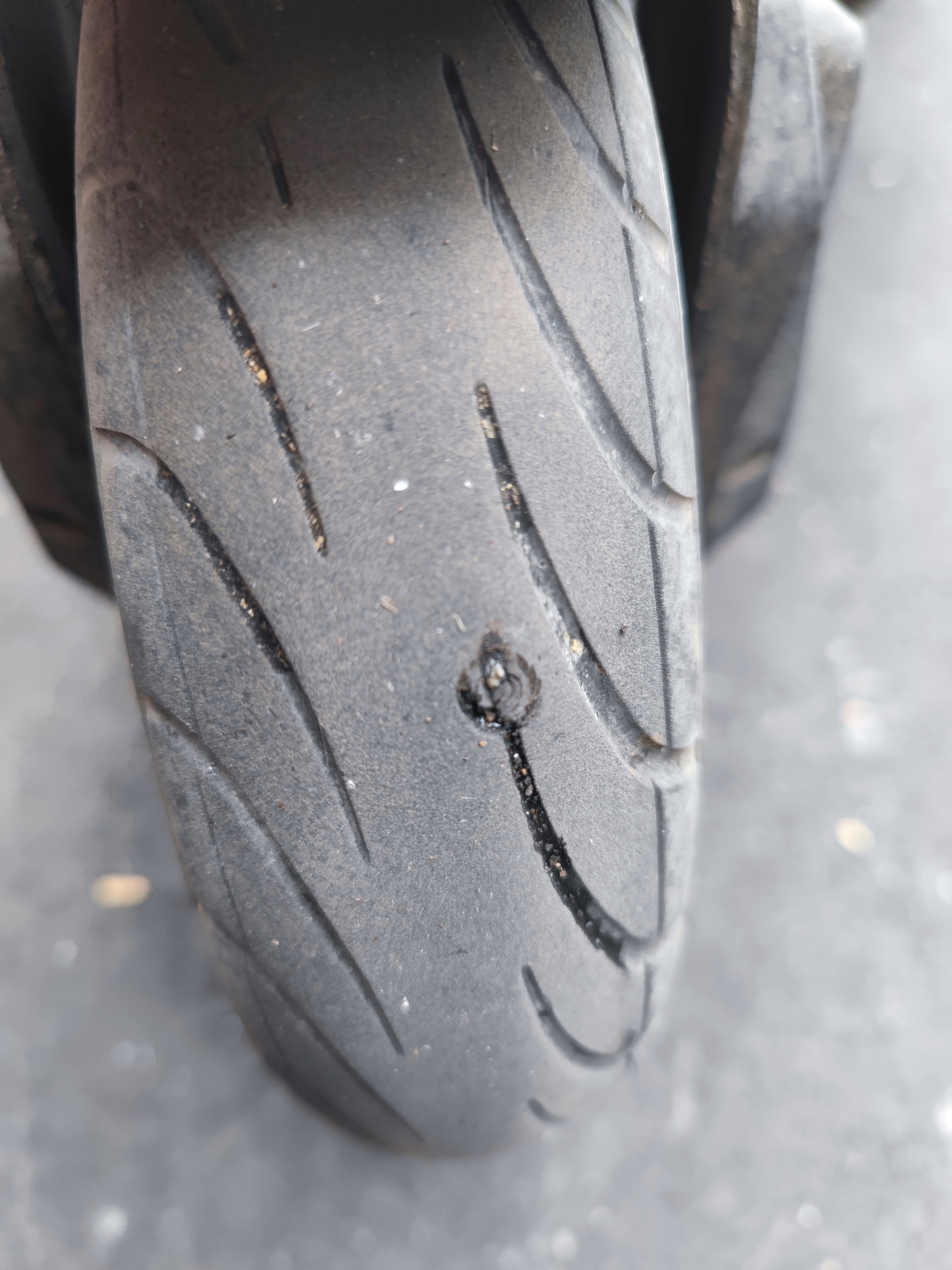 Кто бы там что ни говорил, презрительно морща нос, но жидкий антипрокол работает. Это был саморез по металлу. Заметил только по цоканью на каждом обороте колеса. Сразу выдернуть было нечем, проехал с ним около 10 км.