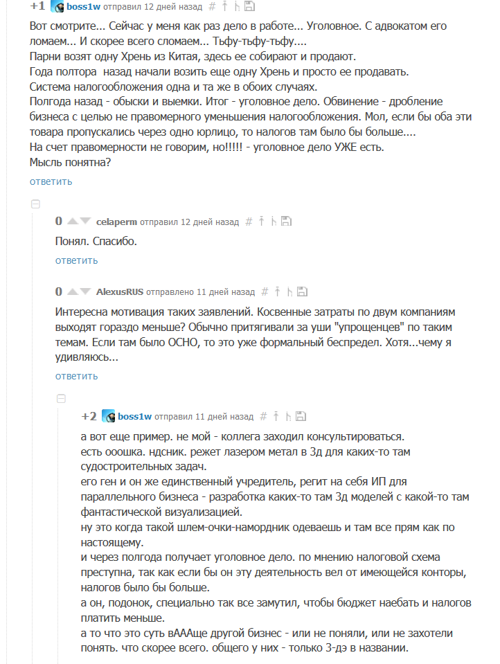 Но это, повторюсь, его частное мнение, а не руководство к действию чиновникам от налоговой и сотрудникам ОБЭПов всей страны. На практике – уголовные дела, сотни миллионов доначисленных налогов и банкротства.