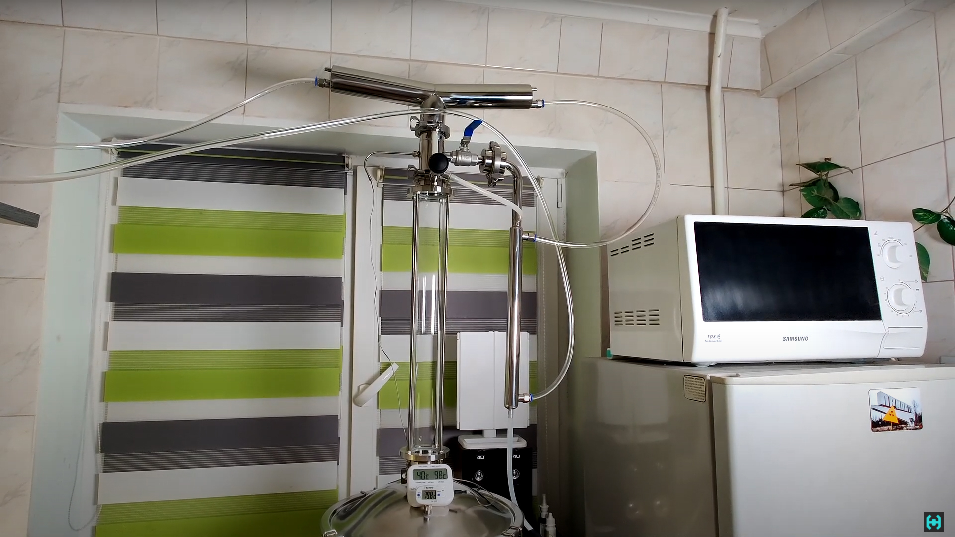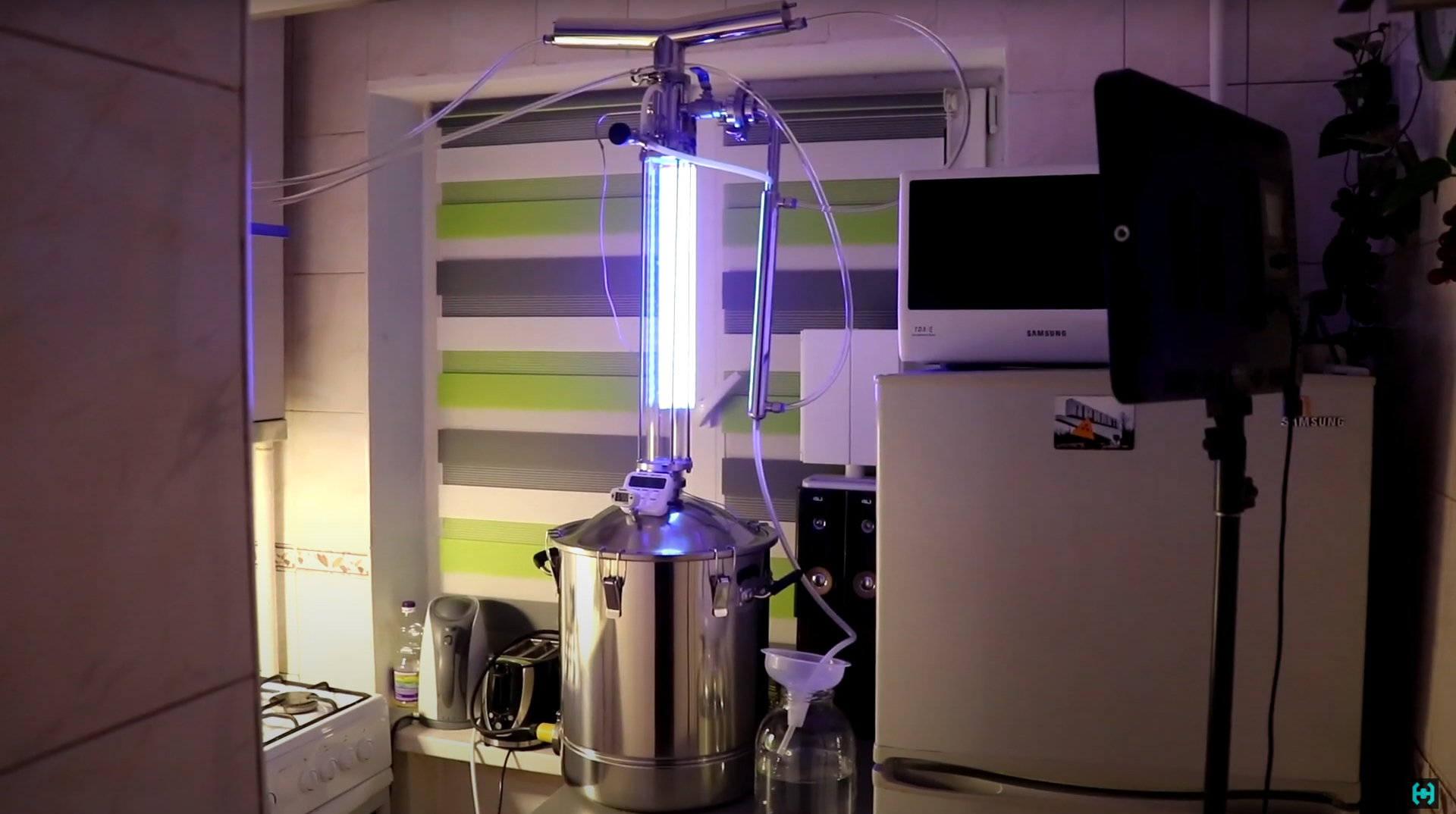 Получившийся спирта-сырец нам необходимо разбавить до 40 градусов и залить обратно в куб для дробной перегонки. Об этом уже пойдет следующий пост, в котором мы соберем ректификационную колонну высотой от пола до потолка и получим чистейший спирт как в аптеке. Теперь, микробы и вирусы не смогут противостоять домашнему антисептику.