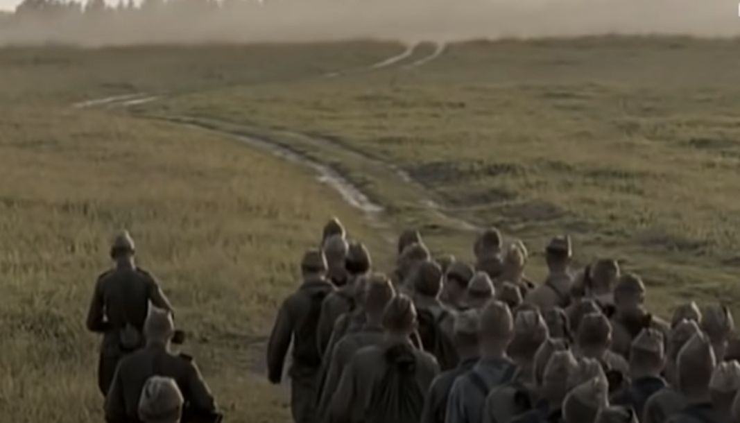 Политических с занятий отпускают, остаются одни уголовники. И вот уже наши добровольцы, находятся в теплушке, и по железной дороге едут на фронт. Звучит гармонь, кто то режется в карты на раздеванье, кто то беседует, один уголовник явно мухлует, за что ему обещают открутить голову. Один из политических, рассказывает душераздирающую историю, о том что в октябре, непонятно правда какого года, и непонятно где, хотя можно предположить что на Украине, у него все зерно под чистую выгребли, из-за чего от голода умерла дочка, потом сын, потом жена и мать, остался он один одинешенек. Поэтому, он недолго думая, ночью, взял поджег свой дом и подался восвояси из деревни. А утром на дороге его цап царап и арестовали, за поджег колхозного имущества, вот же типа сволочи.