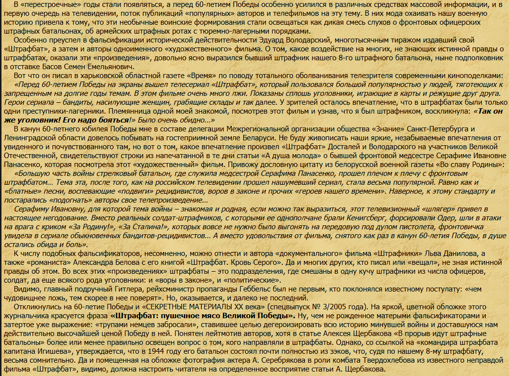 Володарский не стал ссылаться на мнение тех, кто знал о штрафбатах не понаслышке. Он не назвал ни одного имени людей, воевавших в штрафных батальонах, готовых подтвердить его точку зрения, готовых засвидетельствовать, что вместе с ними «искупали вину» лица, не имевшие офицерского звания.