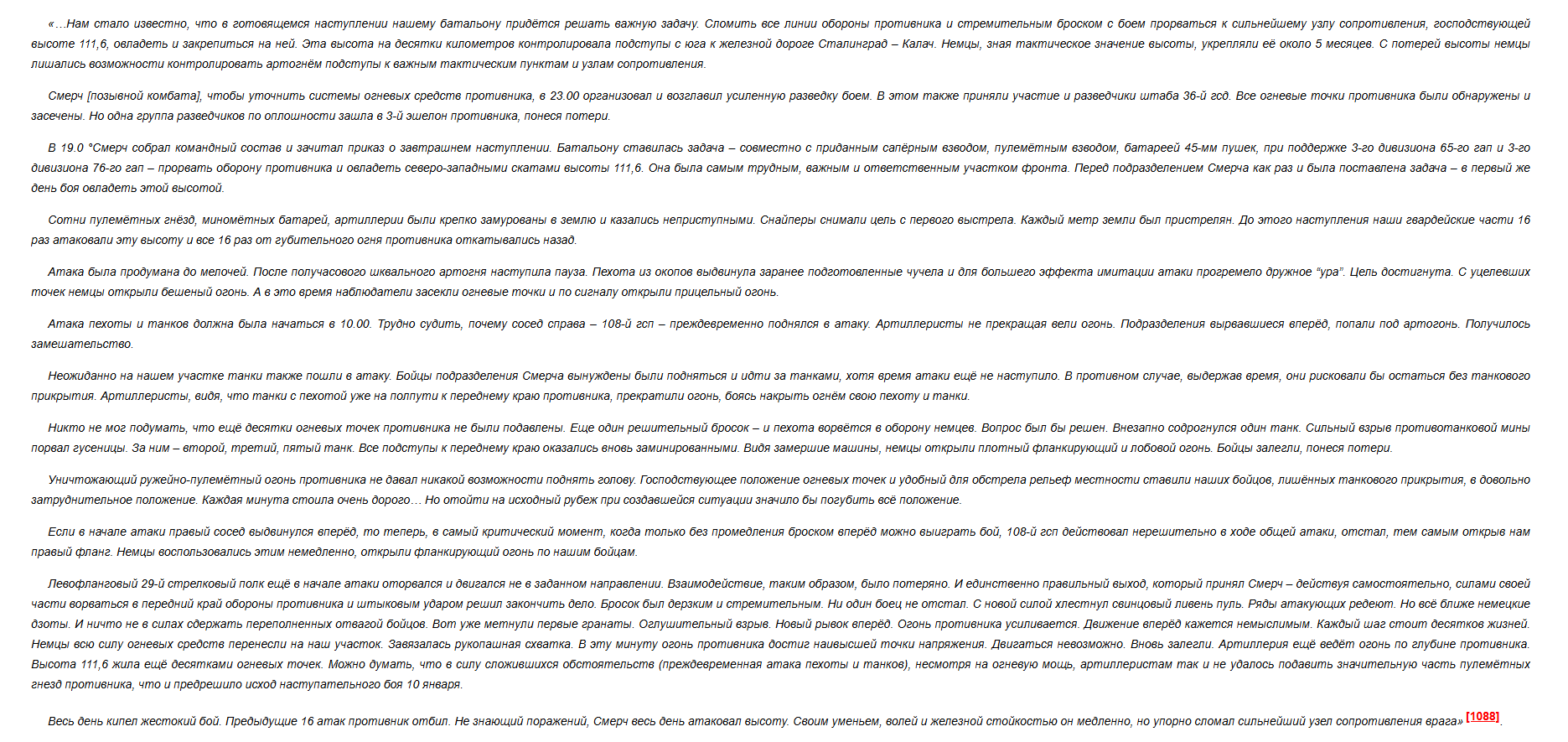Вот выдержка из дневника боевых действий 76-го отдельного штрафного батальона Сталинградского фронта в период с 29 декабря 1942-го по 12 января 1943 года в районе реки Червлёная. Автор дневника, один из офицеров штаба батальона, весьма реалистично описал ход сражения, попытавшись придать дневнику некоторую литературную форму: