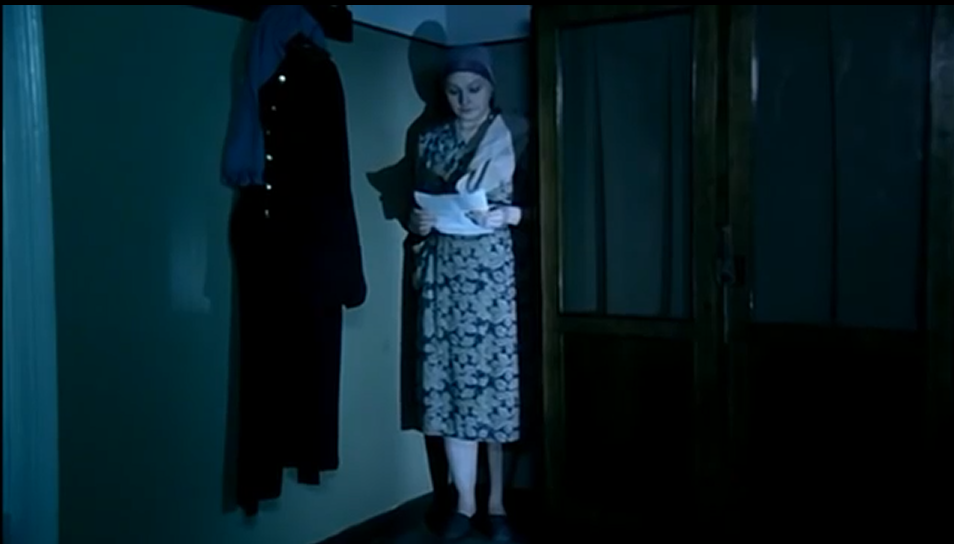 История повторяется, в углу за шкафом появляется женщина, которая начинает зачитывать текст письма, из которого мы узнаем про смерть бабушку, которую из за отсутствия денег похоронили в ближайшей канаве, а так же другие ужасы. Сцены эти с чтением писем смотрятся как наркоманский приход какой-то, потому что сам мужик ПИСЬМА не читает, он все время пялится в угол, где ему мерещится типа как призрак жены, зачитывающий ему всякие ужасы. Кстати, если Потапов письмо не читал, а пялился в угол, откуда тогда он знает содержание письма?