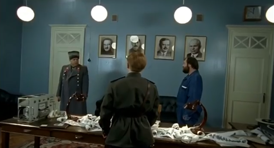 Скляр протирает очки, опять смотрит по сторонам, вновь видит сидящую на стуле Инну Чурикову, после чего говорит, что он этой проблемой не может заняться. Действительно, зачем "кровавому режиму" такие фотоаппараты, пускай лучше такая техника будет только у "продвинутых демократических европейских странах".