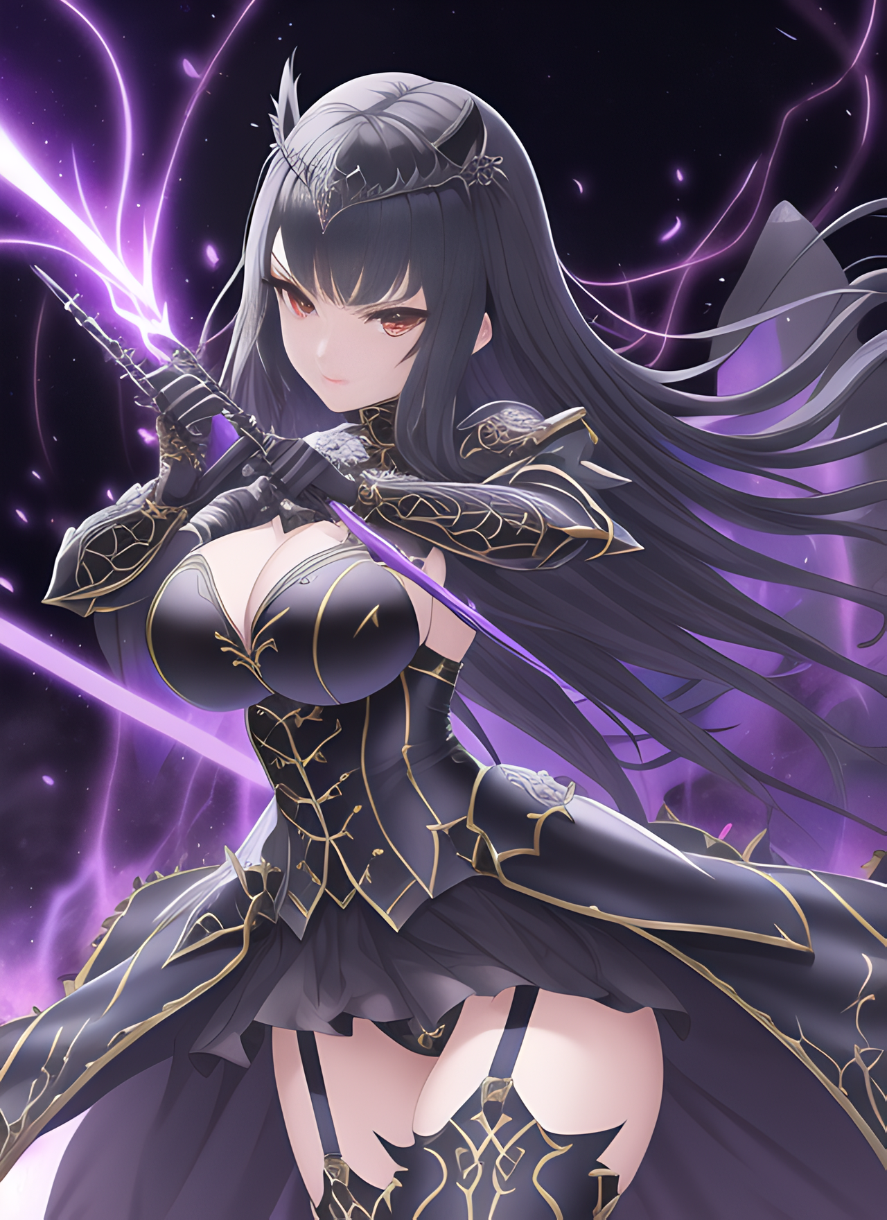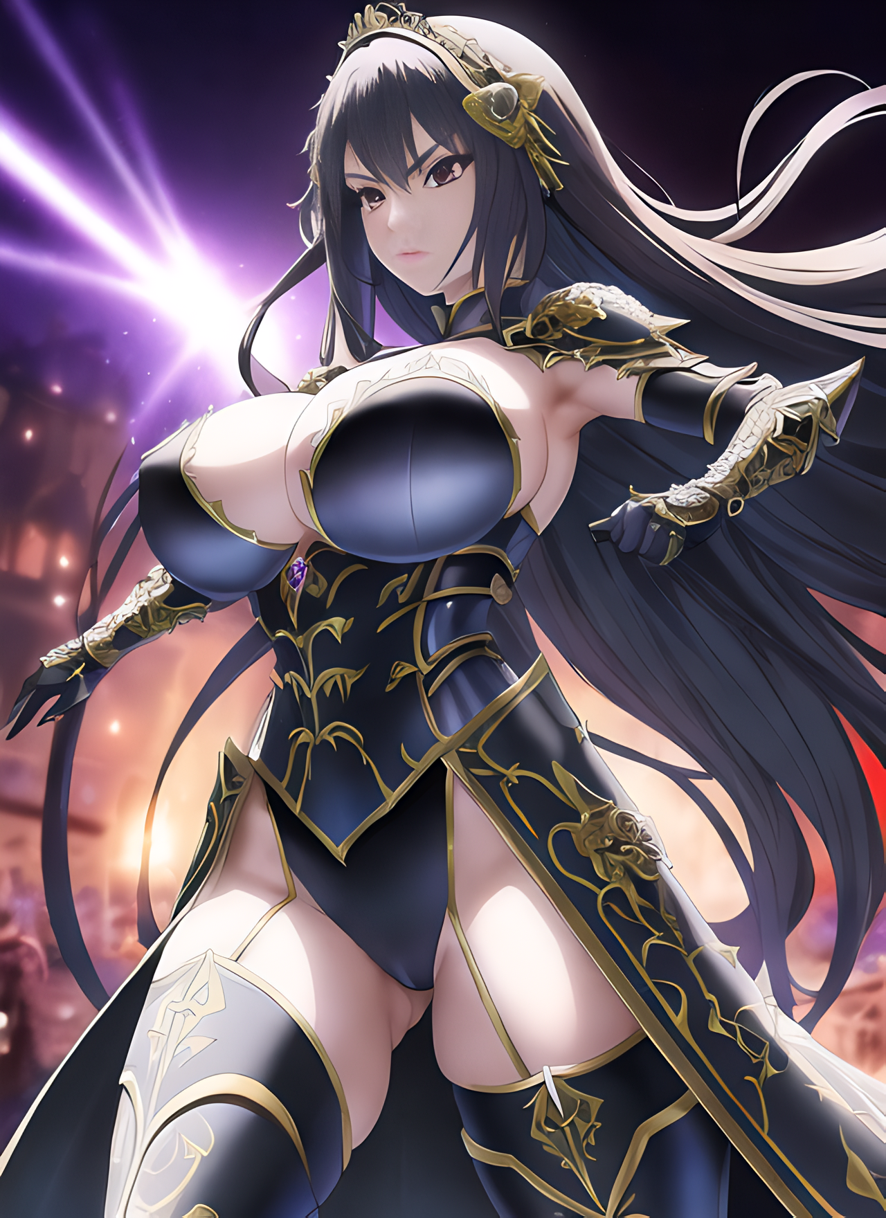 masterpiece, ((anime style)), a charming gothic warrior woman, perfect body, ((bokeh)), cloaked leather armor, dynamic pose, action, sparks everywhere, diadem, portrait, intricate, ((dramatic detailed background)), ((symmetric highly detailed big eyes)), more details, ambient light, concept art, digital art, painting, artstation, Apollonia Saintclair