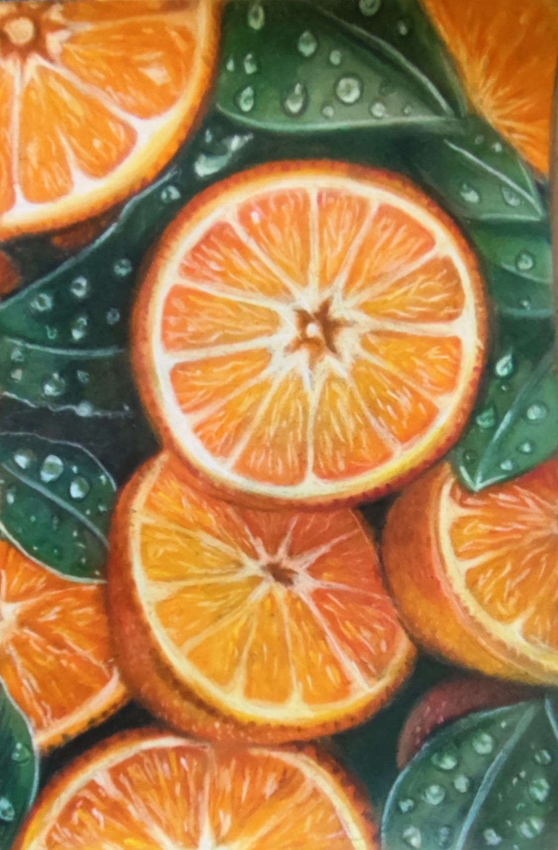 Апельсины . Формат А5 крафт бумага, сухая пастель, цветные угольные карандаши