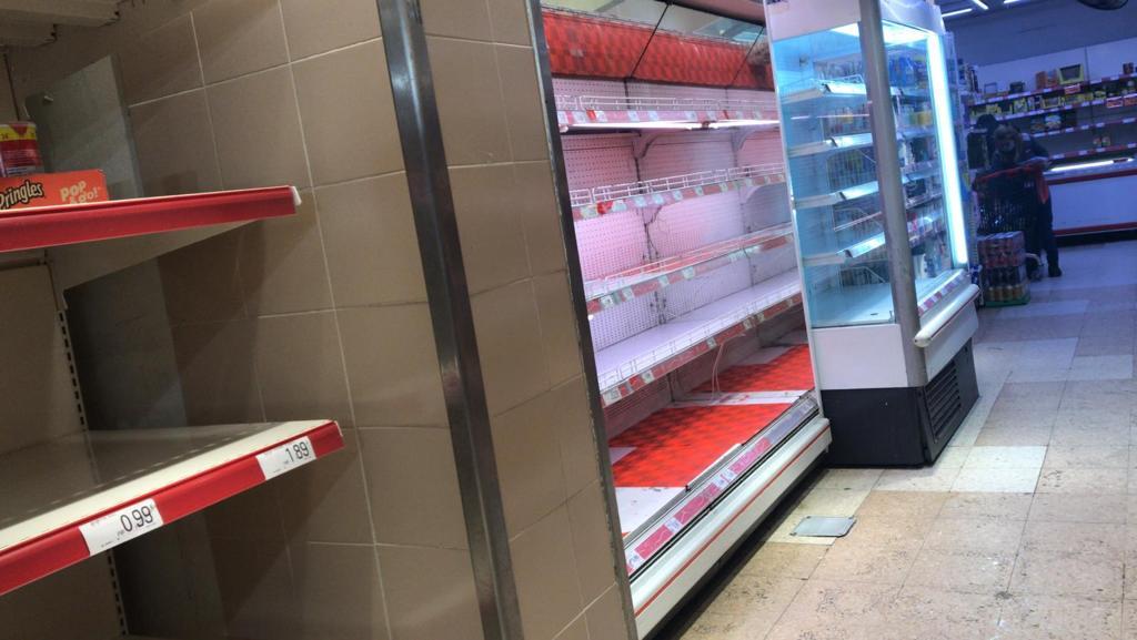 Как видите - еды нет! На полках какие то непонятные орехи, плавленые сыры в банках и всякие специи. Всю нормальную еду купили и сидят по домам. Как говорится "кто успел - тот и съел". Сегодня уже постепенно температура идёт вверх и снег начал таять. Но из-за ночного гололёда пока еду во многие магазины просто не подвозят. Коллапс логистики.
