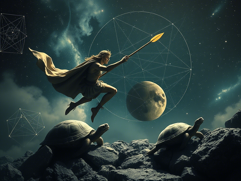 Зенон говорит, что если между Ахиллесом и черепахой тысяча шагов, и Ахиллес бежит быстрее черепахи в 10 раз, он её всё равно никогда не догонит, потому что когда Ахиллес пробежит 1000 шагов, черепаха проползет 100, когда Ахиллес пробежит 100, за это же время черепаха пройдет 10, когда Ахиллес пробежит 10, черепаха будет впереди на 1 шаг, но когда Ахиллес сделает один шаг, черепаха будет впереди на 0,1 шага, потом на 0,01 шага, потом на 0,001 шага и так будет продолжаться до бесконечности, Ахиллес никогда не догонит черепаху.
