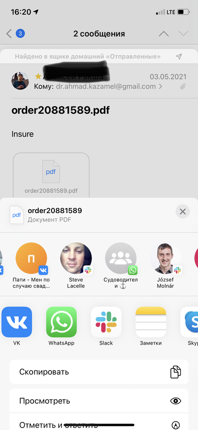 Ну вроде никаких проблем с пдф пересылкой в меседжер из письма. Клик по файлу, поделиться.