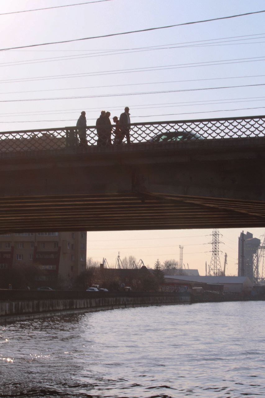 Некоторым не досталось места и они смотрят с моста. Ладно, шучу, это просто мост через Преголю -- местную реку.