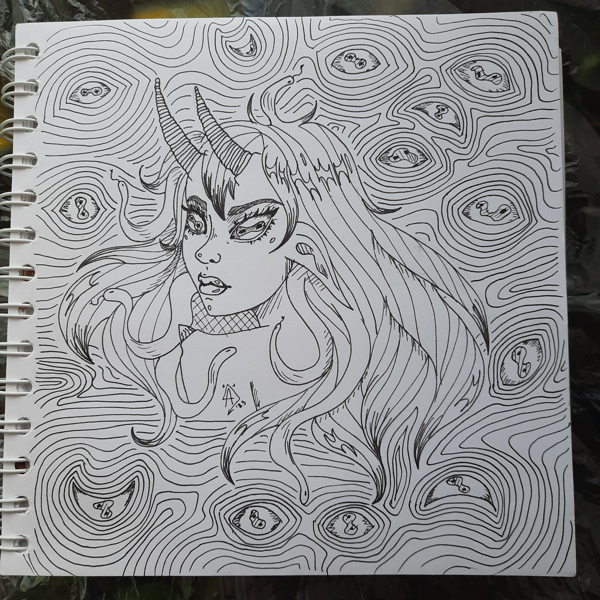 Первый был нарисован в начале апреля. Точнее скетч был готов еще в марте, но к 10 апреля я его добила. Лора у персонажа нет, возможно пока что. Просто демон. Использовался простой карандаш и черный линер 0,2.