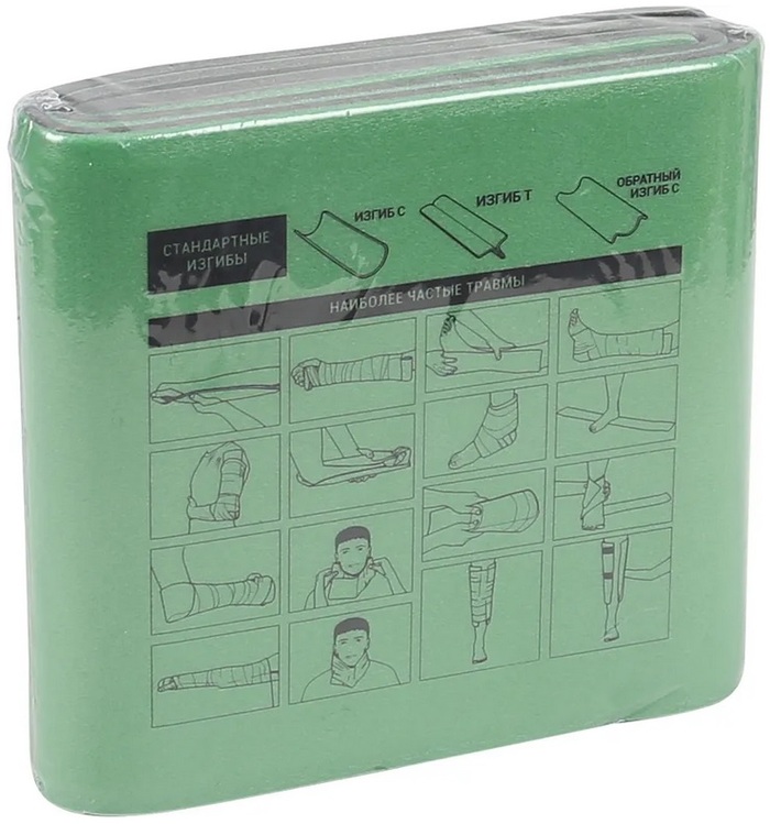 5) Шина иммобилизационная. Второе название «карманный гипс». Состав: алюминий, пористая резина. Размеры: 11х91 см или 15х91 см. Как ясно из названия, применяется для фиксации конечностей при переломах. Гнется и режется любыми ножницами, пропускает рентгеновское излучение.